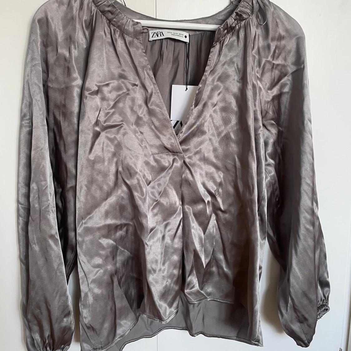 Gröngrå blus från zara, finns en knapp vid halsen man kan knäppa. aldrig använd