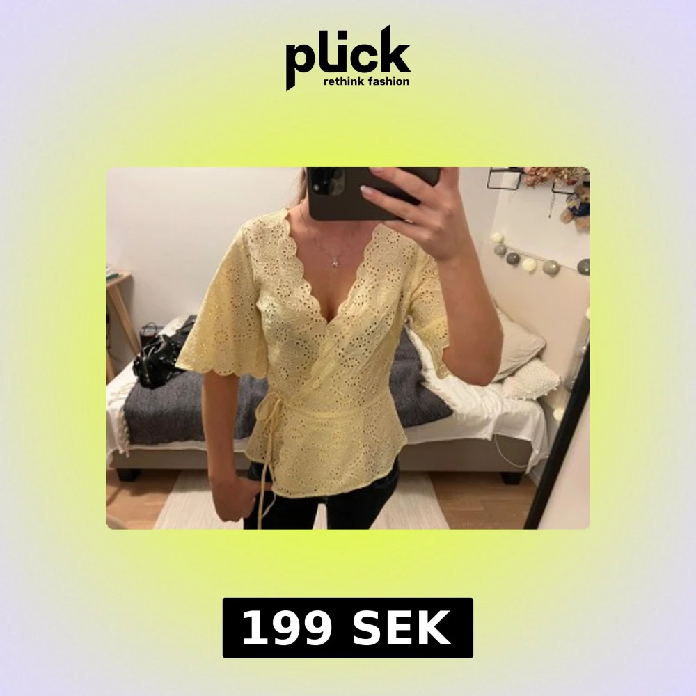 Söt gul omlottopp med broderade hålmönster och scallop-kant. Toppen har knyt i midjan, v-ringning och korta, lite utsvängda ärmar. Perfekt för vår och sommar, ger en romantisk vibe och är superfin till både jeans och kjol.