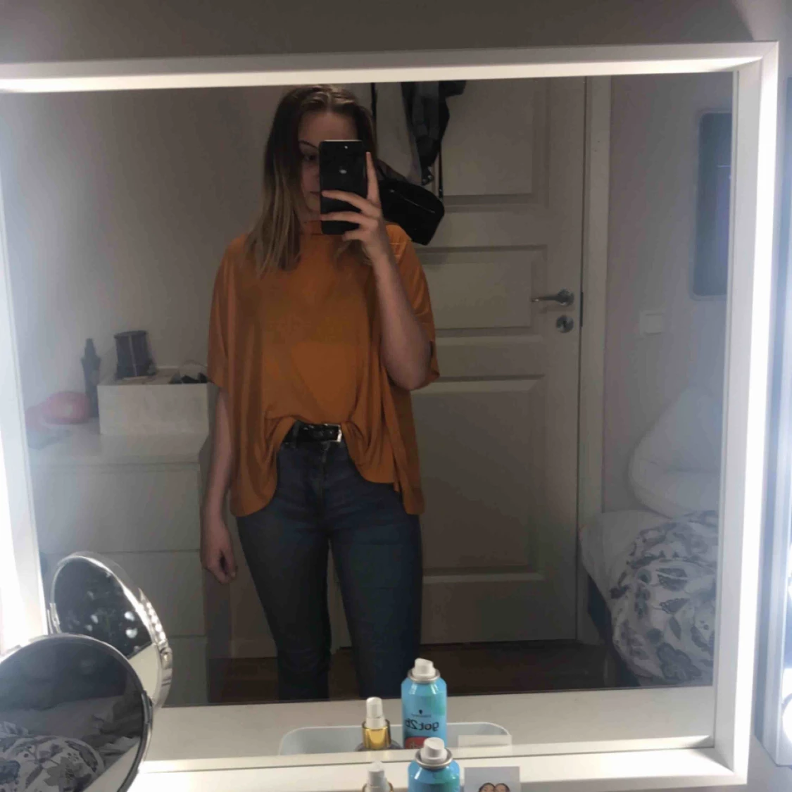 En gul/orange blus som e luftig och skön/mjuk, den har som ett snitt på baksidan