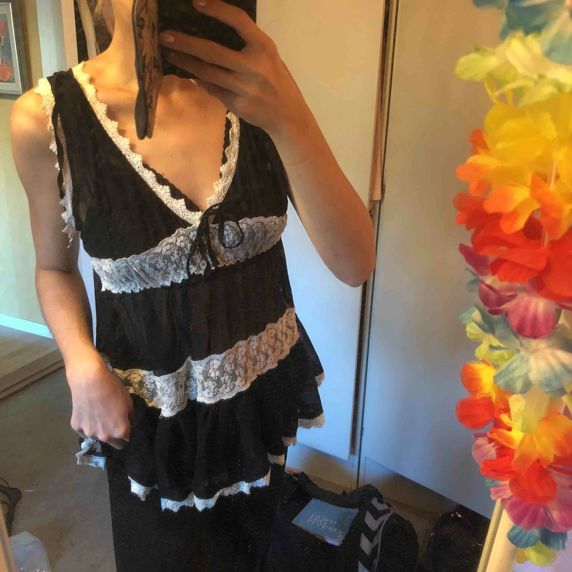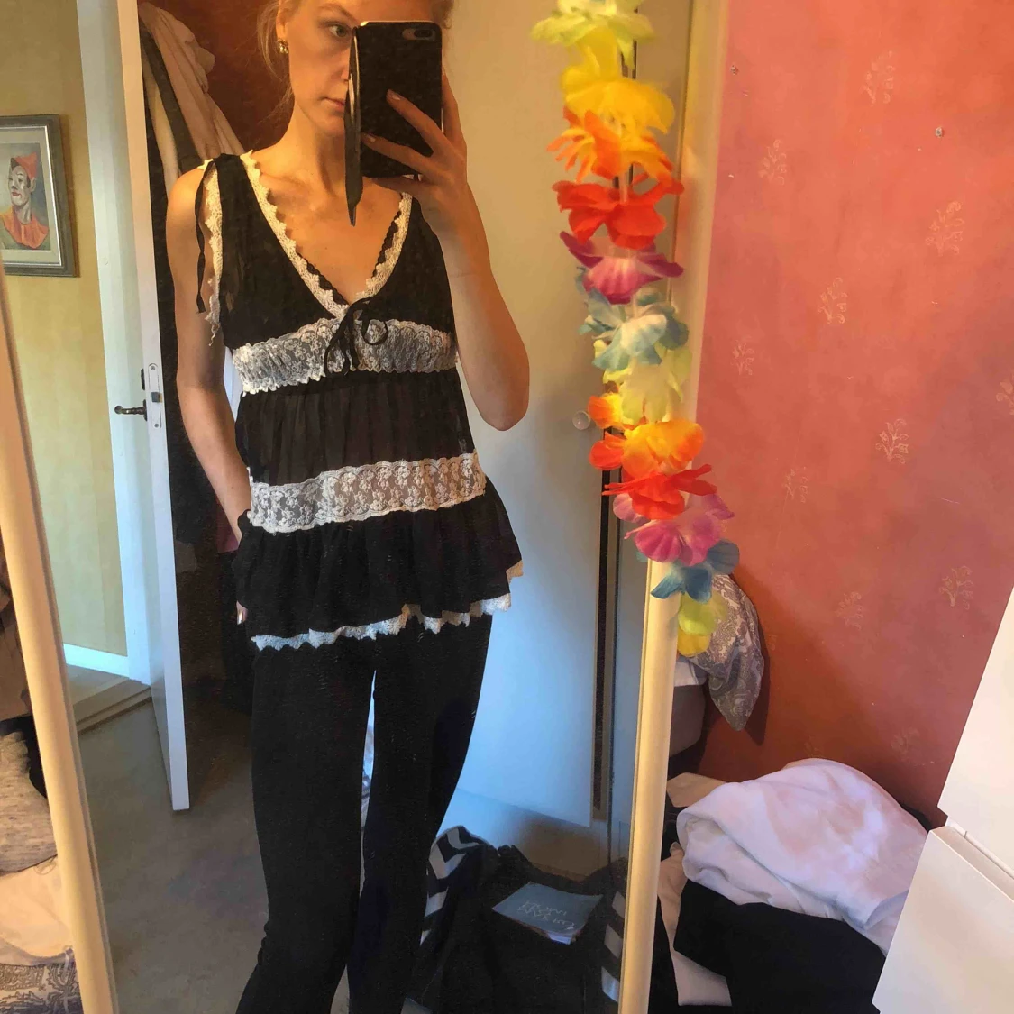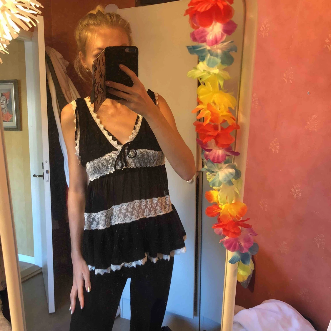 Superfint svart linne/topp/blus med vita spetsdetaljer, superfin som den är men passar även med någon fin kavaj! Rosett man knyter framtill. Passar någon med XS-L, den är stretchig 🌷