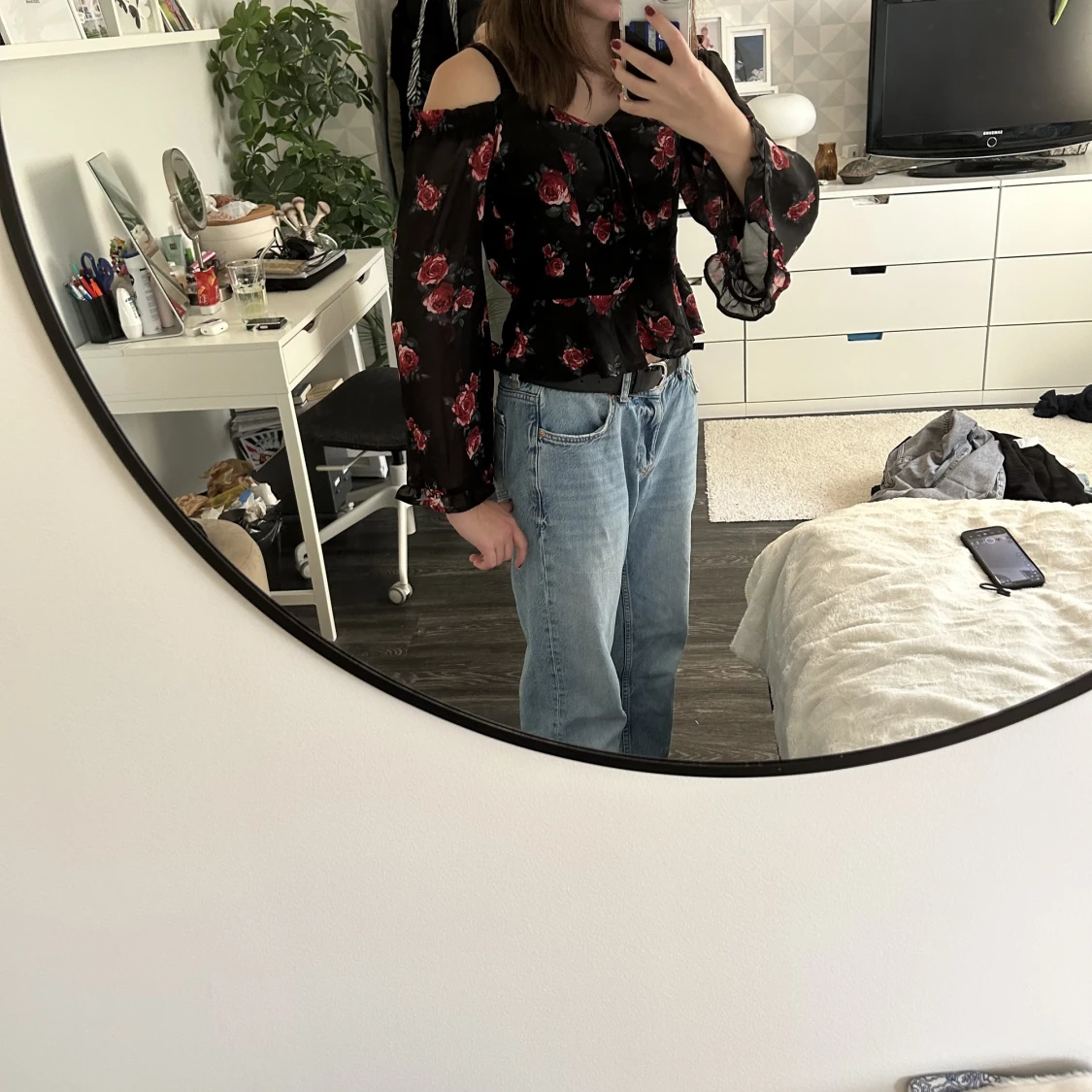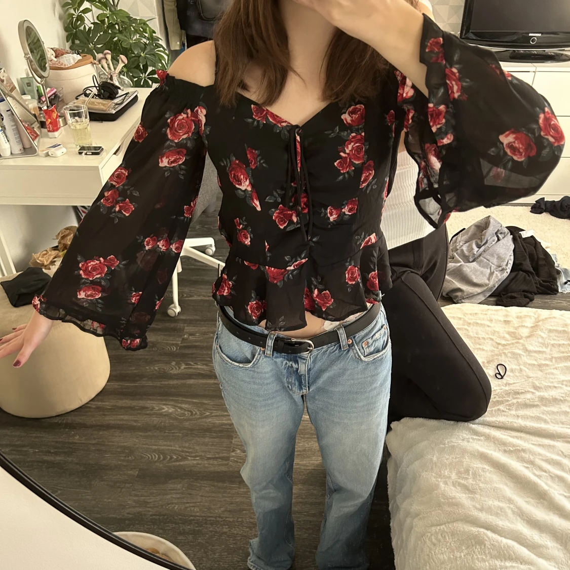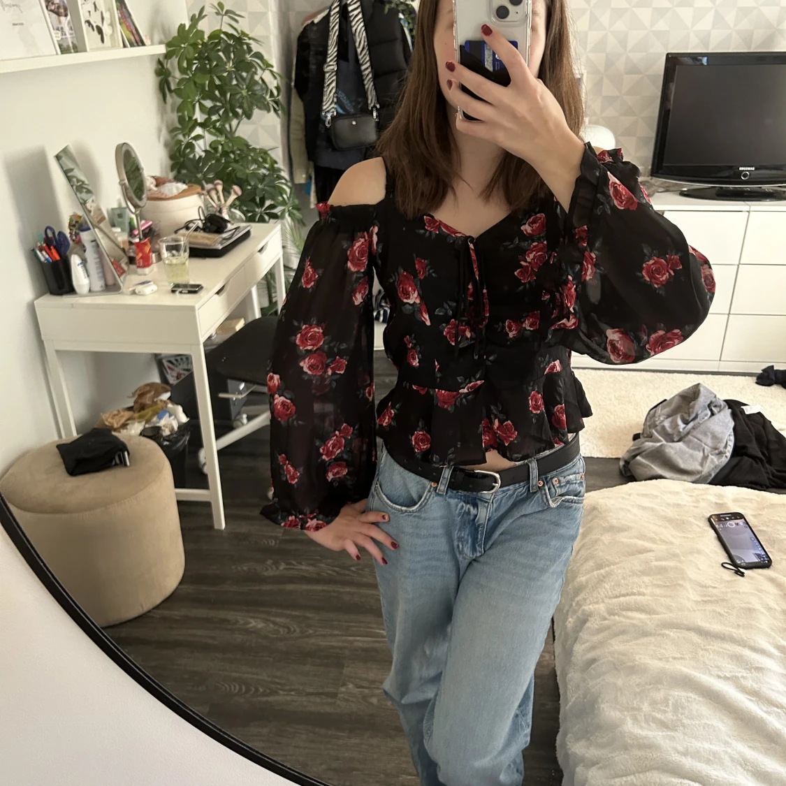 Svart långärmad blus med röda blommor från Hm i stl 38. Bra skick, säljer pga av att den inte passar mig.