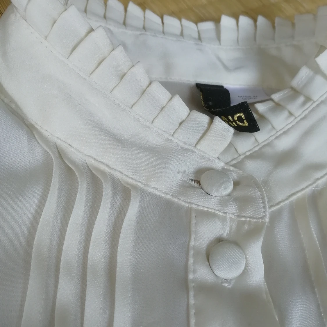 Vacker skir och glansig topp från H&M premium. Har ett bälte med hällor och knappar på framsidan, samt litet volanger/plisseringar Otroligt vacker, bara inte riktigt min stil. Man ser definitivt elegant ut i den! Fest, student, eller som uppklätt.