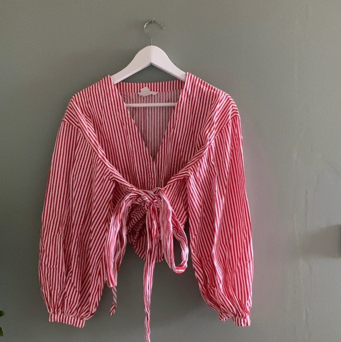 En supersöt knytblus ifrån HM med knyte i midjan. Endast använd en gång och säljes nu p.g.a att jag aldrig använder den, väldigt fint skick.