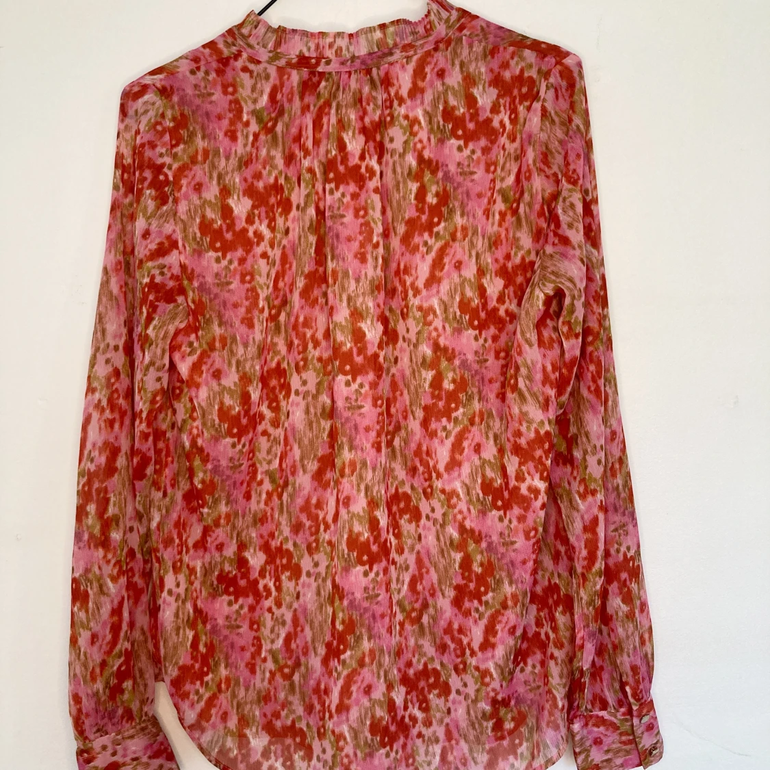 Blommig blus i rött och rosa. Storlek XS-S, material polyester. I princip oanvänd.