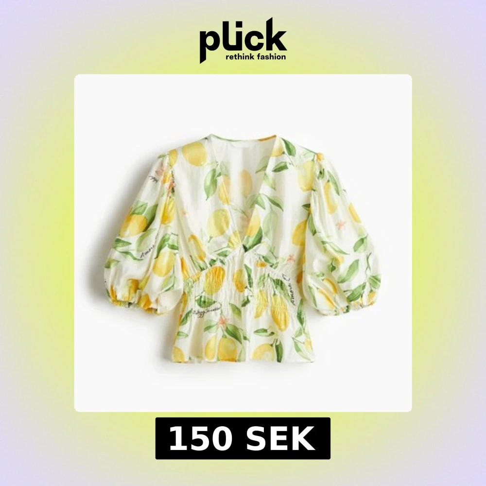 Helt ny köpt och Superfin vit blus med färgglatt citronmönster och gröna blad. Blusen har v-ringning, puffiga trekvartsärmar och smockad midja som ger en snygg siluett. Perfekt för dig som vill sticka ut med en fräsch och somrig vibe!