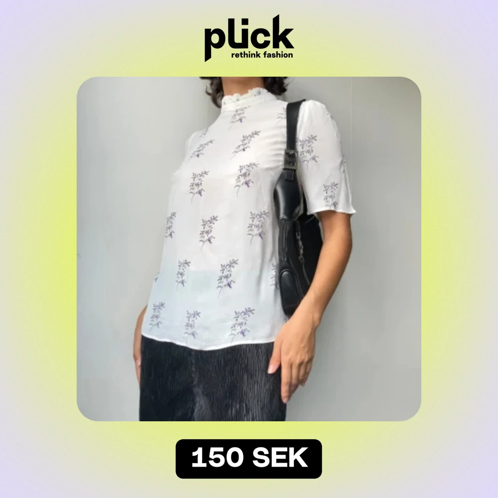 • SLIGHTLY SHEER WHITE BLOUSE TOP WITH PURPLE FLOWER PRINT • SIZE - M/EU 38/US 8 (Fits XS-S) • BRAND - H&M • MATERIAL - 100% viscose