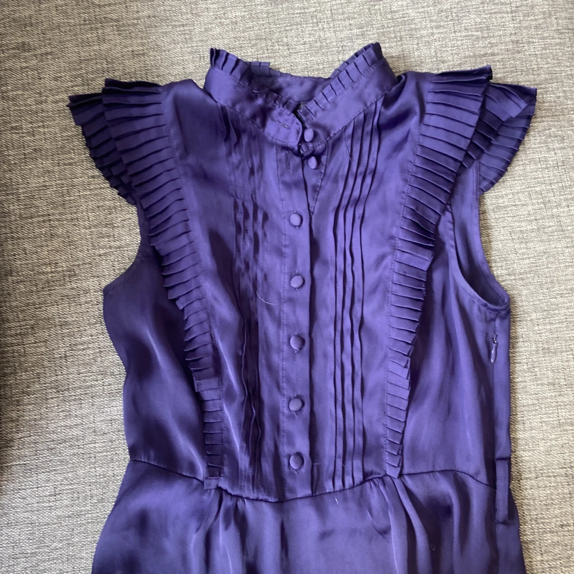 En lila blus med volangliknande detaljer och knappar, ska ha ett skärp eller något liknande men fanns inget när jag köpte det begagnat (Frakt tillkommer)