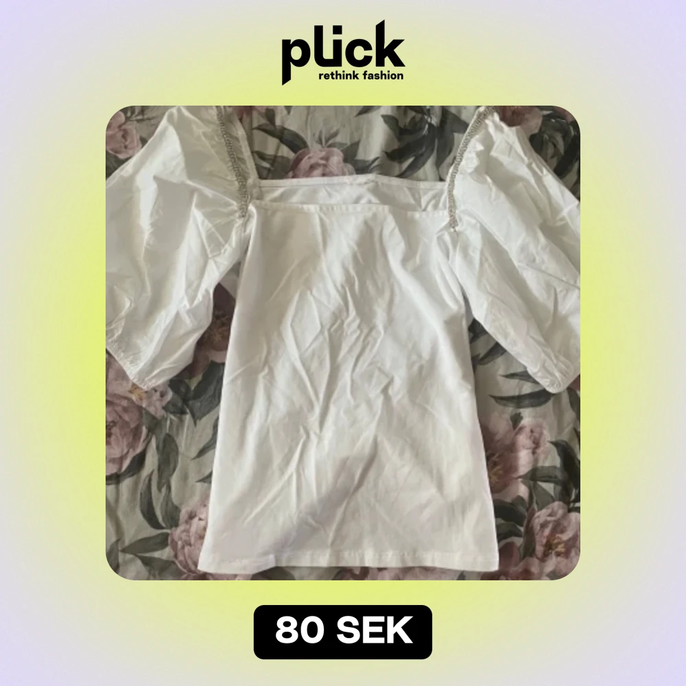 Vit tröja som är stretchiga men armarna är som en blus. Dom har fina diamanter på armarna och till och med på vallistan som man ser på andra bilderna. I storlek S från H&M