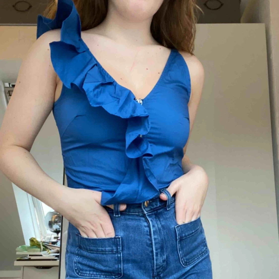 Ball blå urringad blus från HM men volang längs ena sidan. Omsluts med den dragkedja framtill. Lite croppad. Använd ett fåtal gånger. Frakt tillkommer. Skriv för mer info.