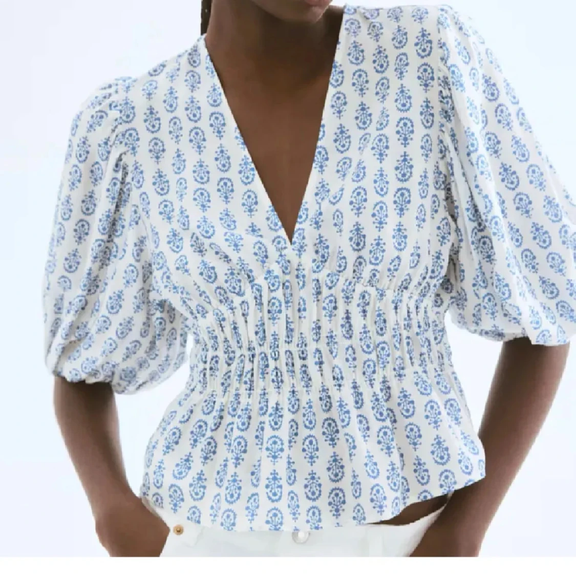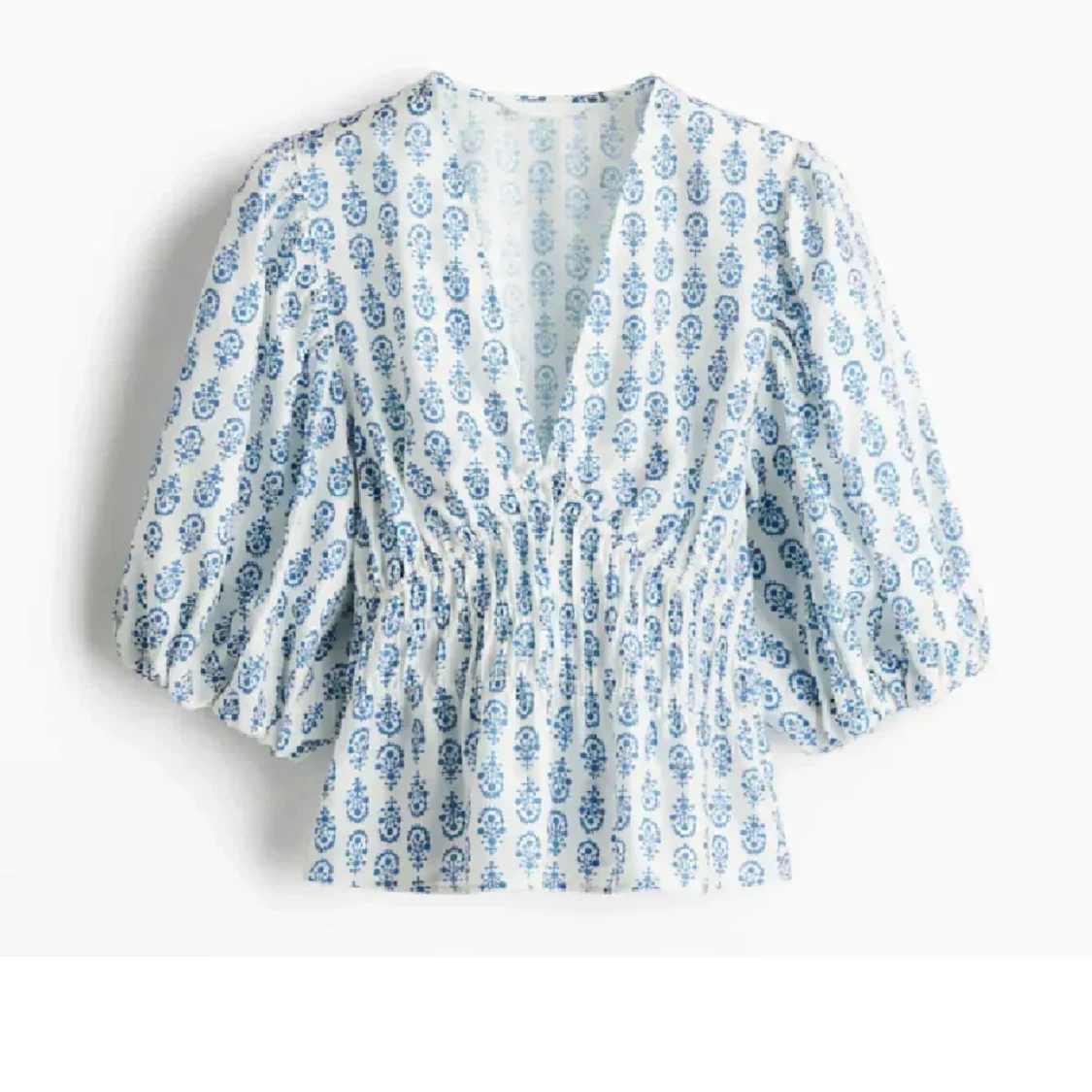 Supersöt blus i vitt med blått blommönster, djup v-ringning och smockad midja. Puffiga trekvartsärmar ger en trendig siluett. Perfekt till jeans eller kjol för en fräsch look. Knappt använd och superbra skick, storlek M men ganska liten i storleken, funkar för mig som brukar ha xs, men en aning stor💙
