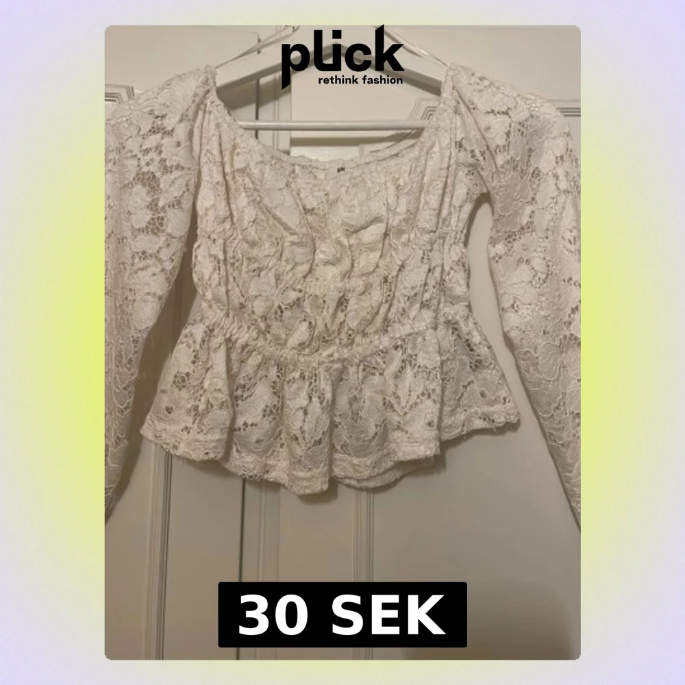 Superfin vit blus i spets från H&M med volang nertill och långärmade puffärmar. Blusen har en romantisk känsla med sitt genombrutna spetsmönster och bred urringning. Perfekt att styla med jeans eller kjol för en trendig look.