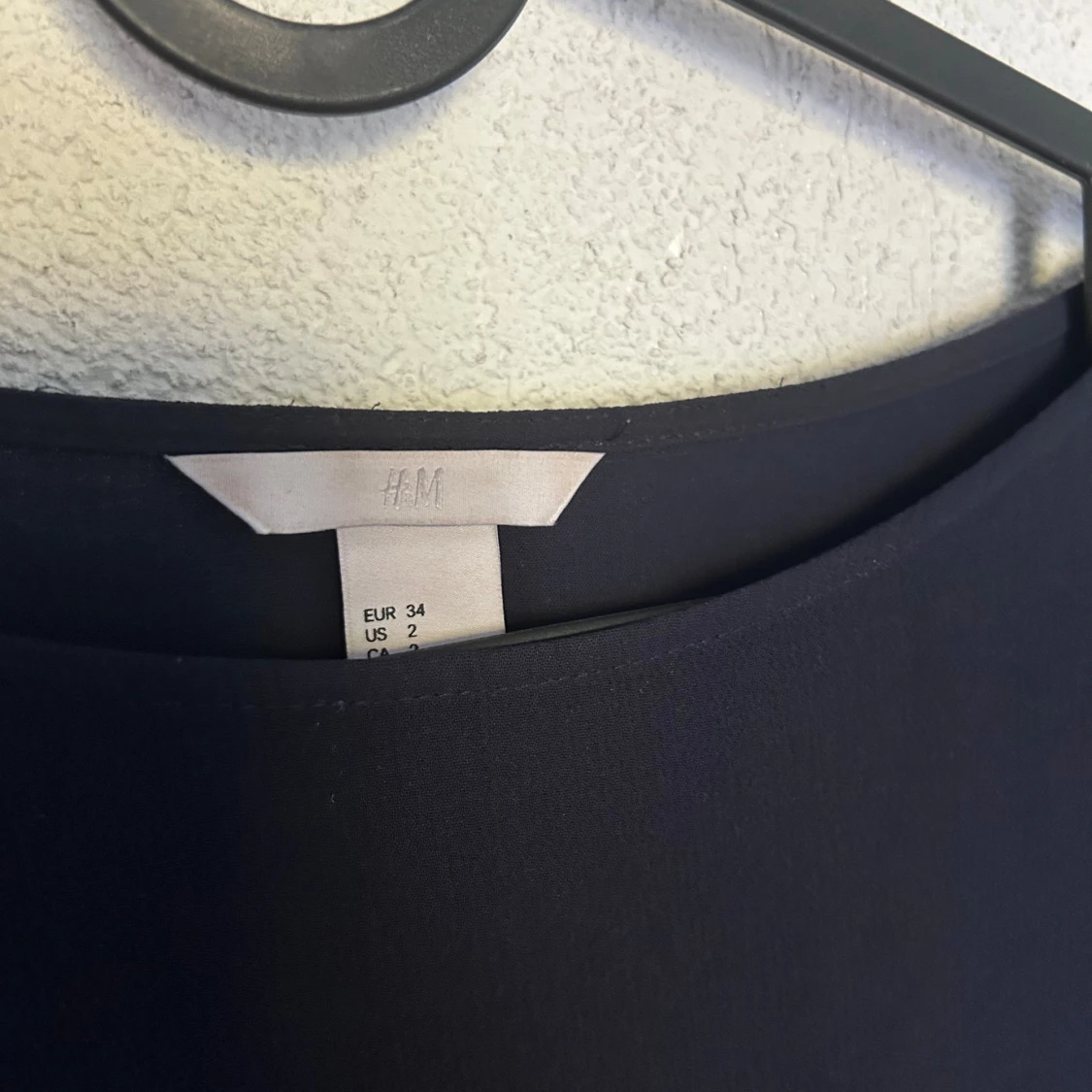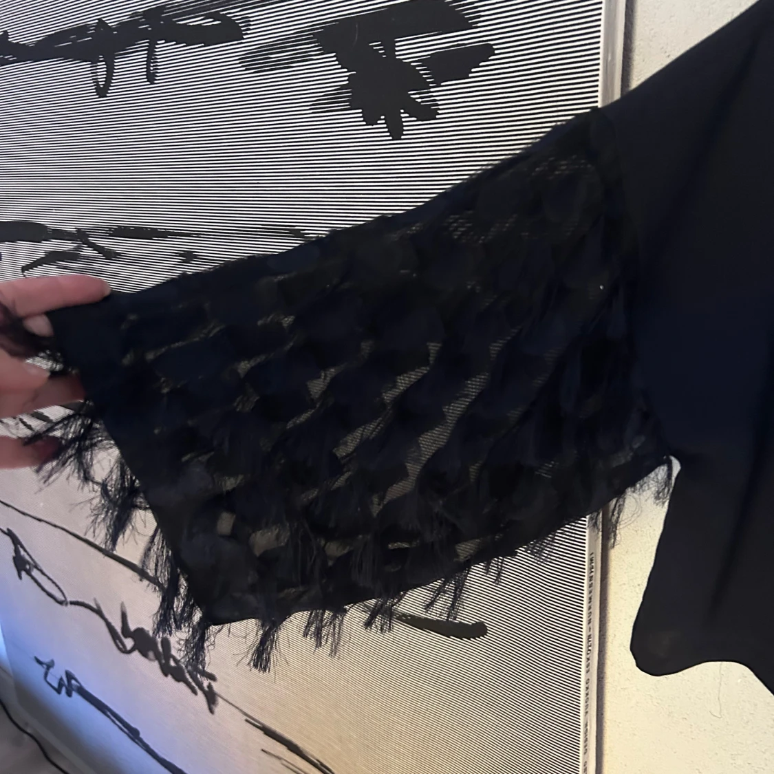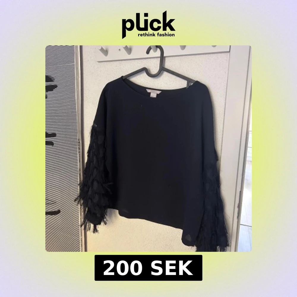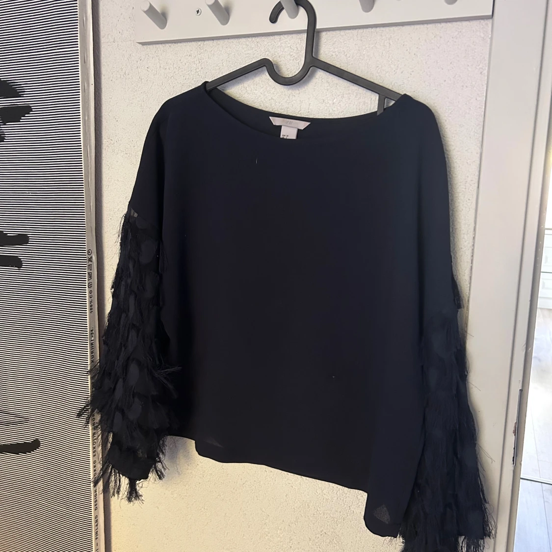 Mörkblå blus från H&M med långa ärmar dekorerade med fransar och transparenta detaljer. Blusen har en rak passform och rund halsringning. Ärmarna har en unik struktur med inslag av mesh och fransar som ger en cool och trendig look.