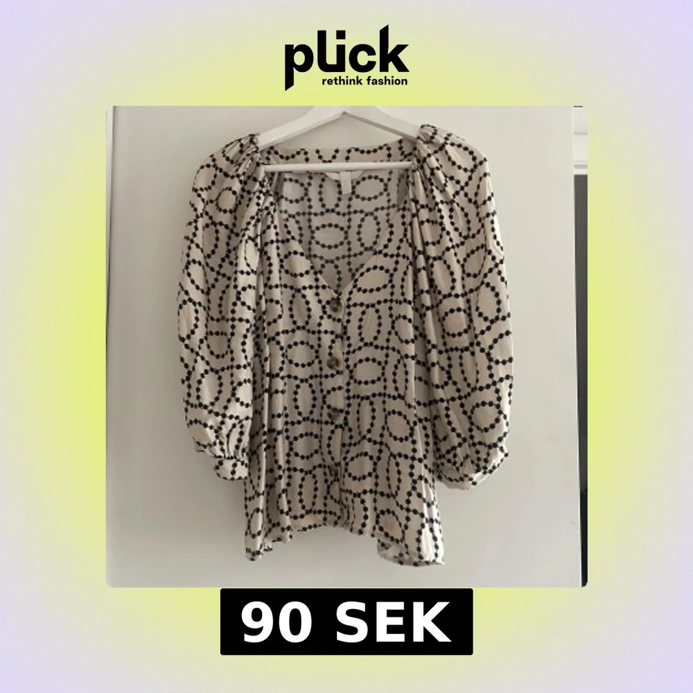 Söt somrig blus med djup v-ringning. Puffärmar med knäppning. Beige botten med svarta prickar.