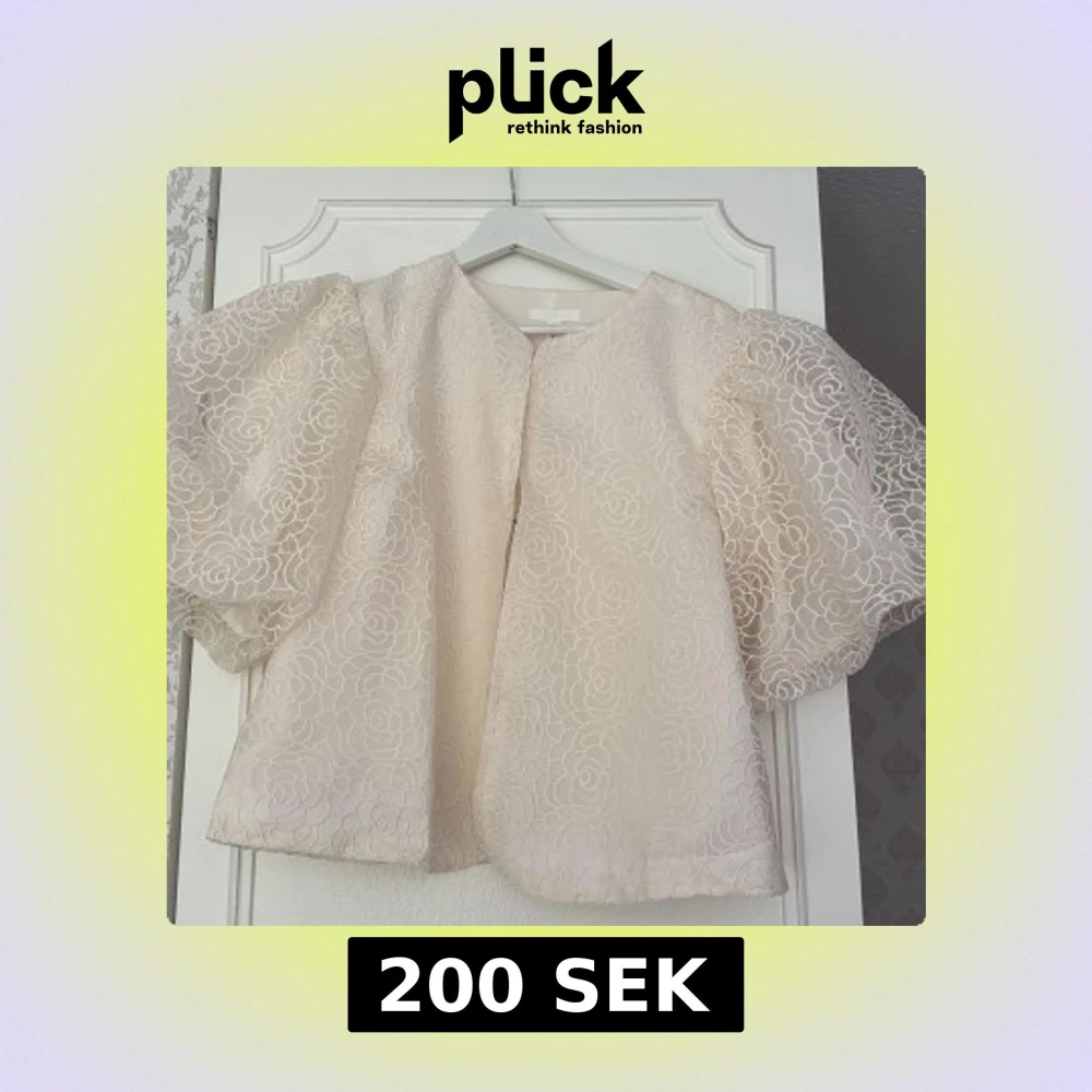 Superfin beige blus med broderade blommor och stora puffärmar.