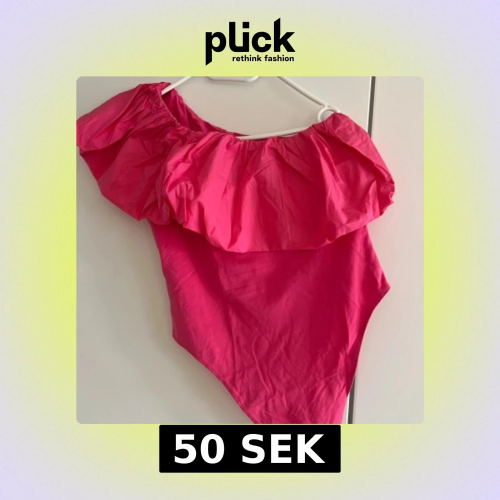 Snygg rosa topp med stor volang upptill och asymmetrisk axel. Perfekt för dig som vill sticka ut på stranden eller vid poolen. Materialet känns lätt och bekvämt mot huden. Supersnygg och trendig design!