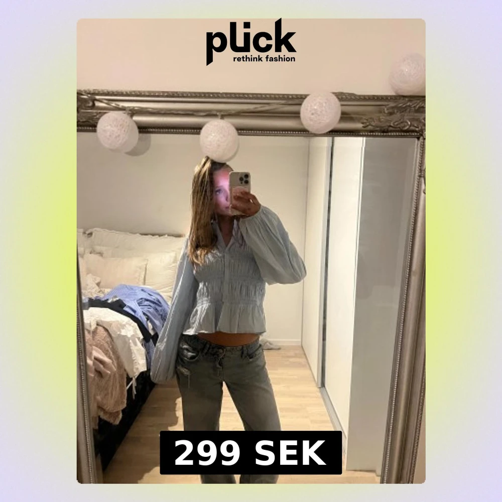 Säljer en ljusblå blus med smockad överdel och volang nedtill. Blusen har långärmade puffärmar, knappar framtill och en liten ståkrage. Materialet känns som bomull och toppen är croppad i modellen. Perfekt för dig som gillar romantisk och trendig stil.