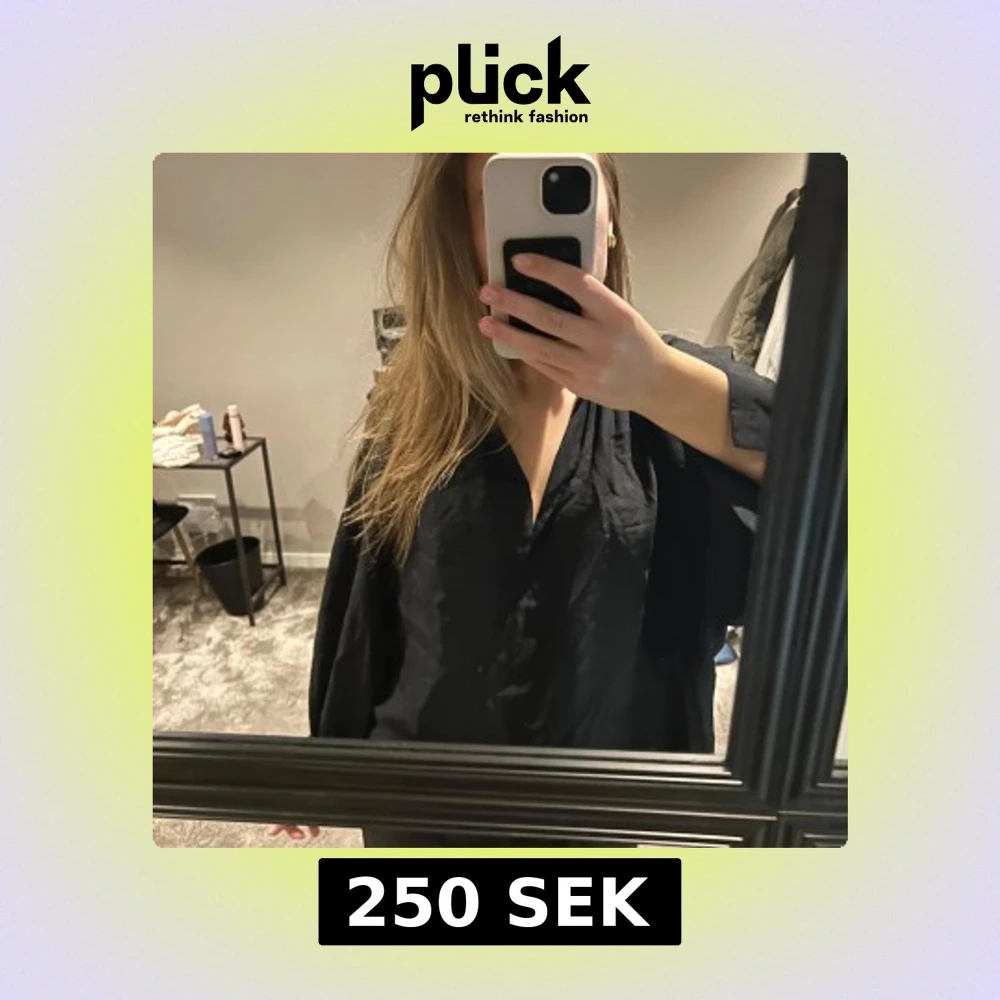 Säljer en svart blus från h&m med v-ringning och vida ärmar. Blusen har en snygg pärlknapp vid ärmslutet som extra detalj. Tyvärr har ena knappen gått av men det finns medföljande extra knapp som man enkelt kan sy på!! Passar s/m