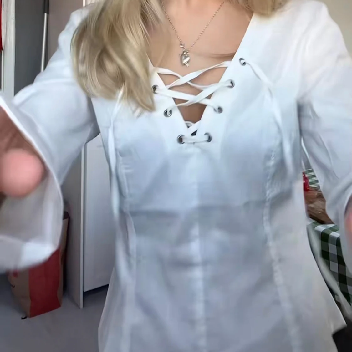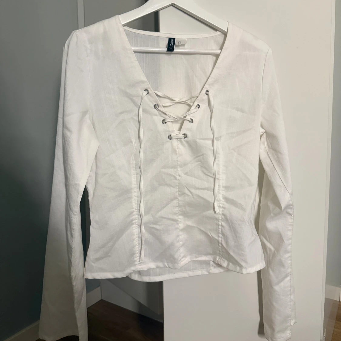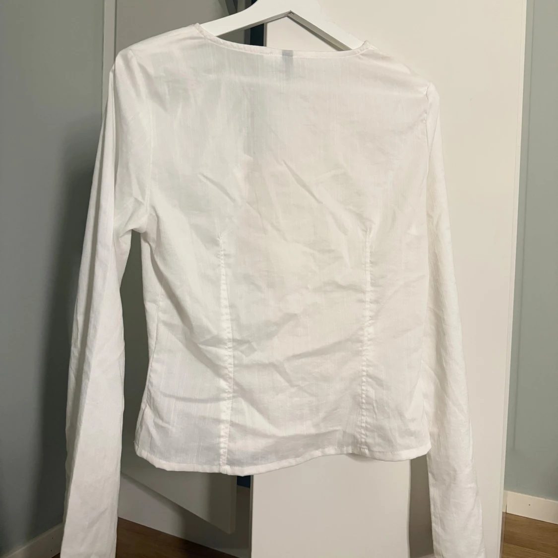 Hej!! Säljer denna såå fina vita blusen med knytning över bröstet då den helt enkelt inte kommer till någon användning. Blusen är stilren och får en verkligen att se brun och fräsch ut! Den har inga defekter och är i mycket fint skick, (endast använd 2-3 gånger). Väldigt eftertraktad dessutom då den inte går att köpa längre. Om du skulle ha några frågor är det bara att höra av dig, annars går det superbra att trycka på ”köp”.