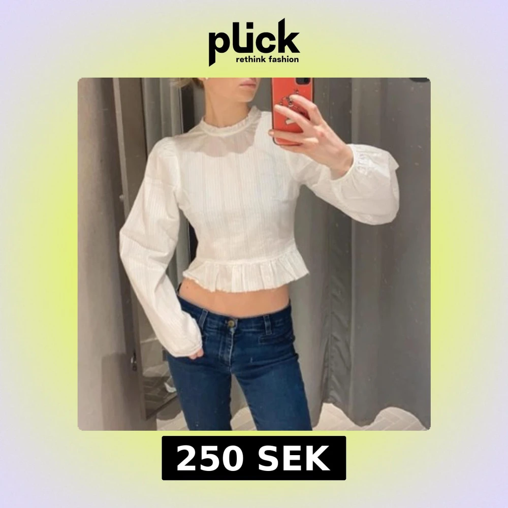 Söt vit blus med lång ärm och volangkant nedtill. Blusen har en lätt rynkad hög hals och är croppad i modellen. Perfekt att styla med jeans eller kjol.