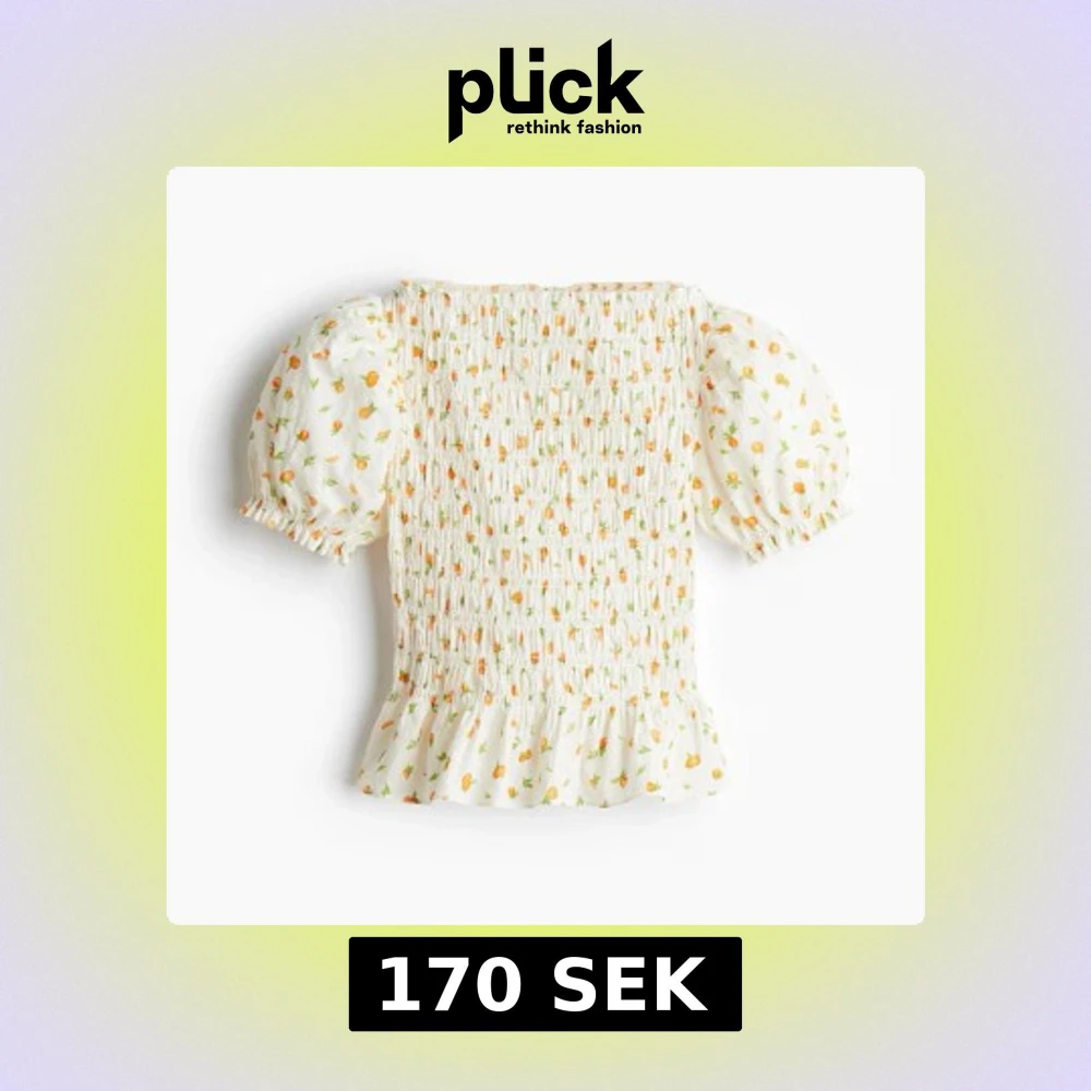 Säljer denna topp från hm i storlek S, toppen är vit med apelsiner på och puffiga ärmar, bra skick använd nån enstaka gång