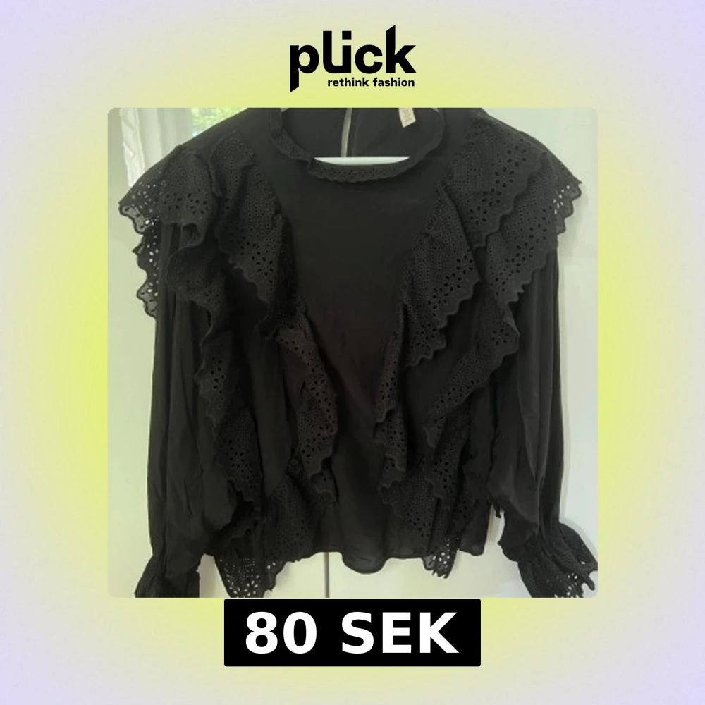 En fin svart blus med volanger på framsidan och på slutet av ärmarna. På sista bilden kan man se att blusen är bred i armarna.