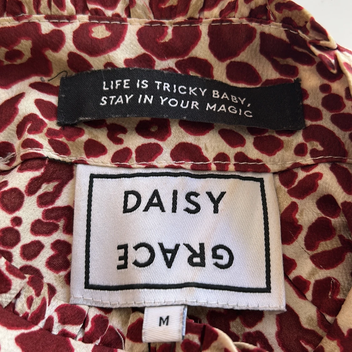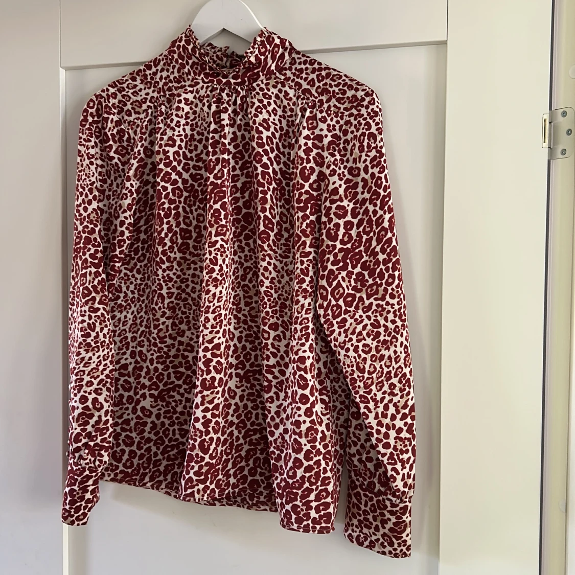 Blusen har används vid ett tillfälle, är i fint skick. Klädda knappar både vid armar och vid knäppningen i nacken.