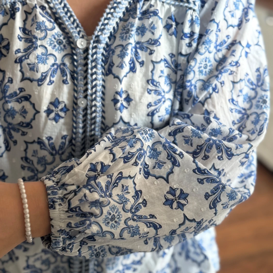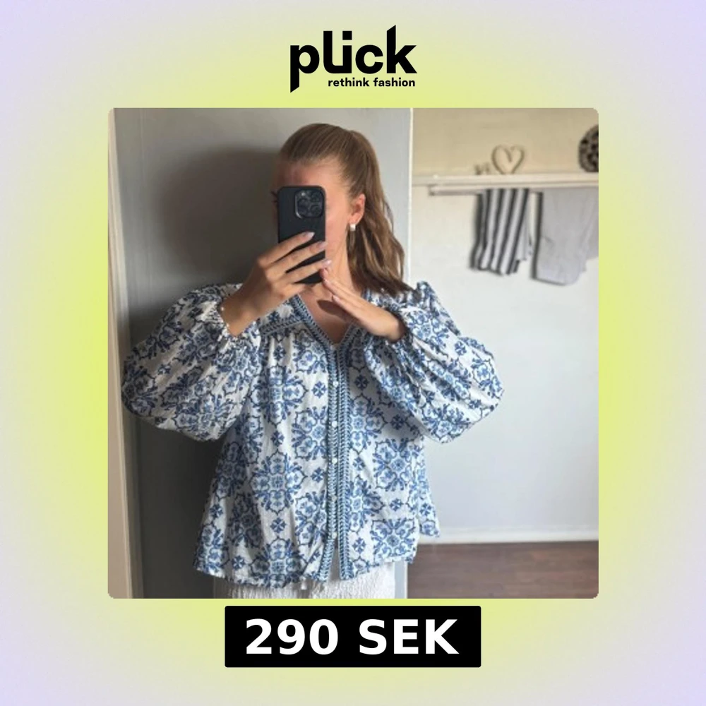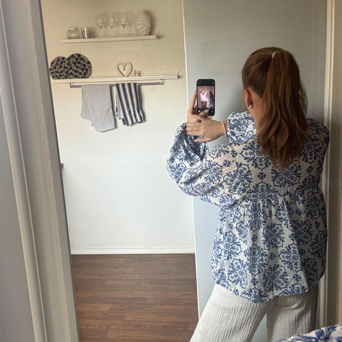 Säljer en superfin blus med blommigt blått mönster på vit botten. Den har puffiga långärmar med resår vid handlederna, v-ringad hals och knappar framtill. Använd ett fåtal gånger och är vi fint skick🌸 superfin till semester eller middagar