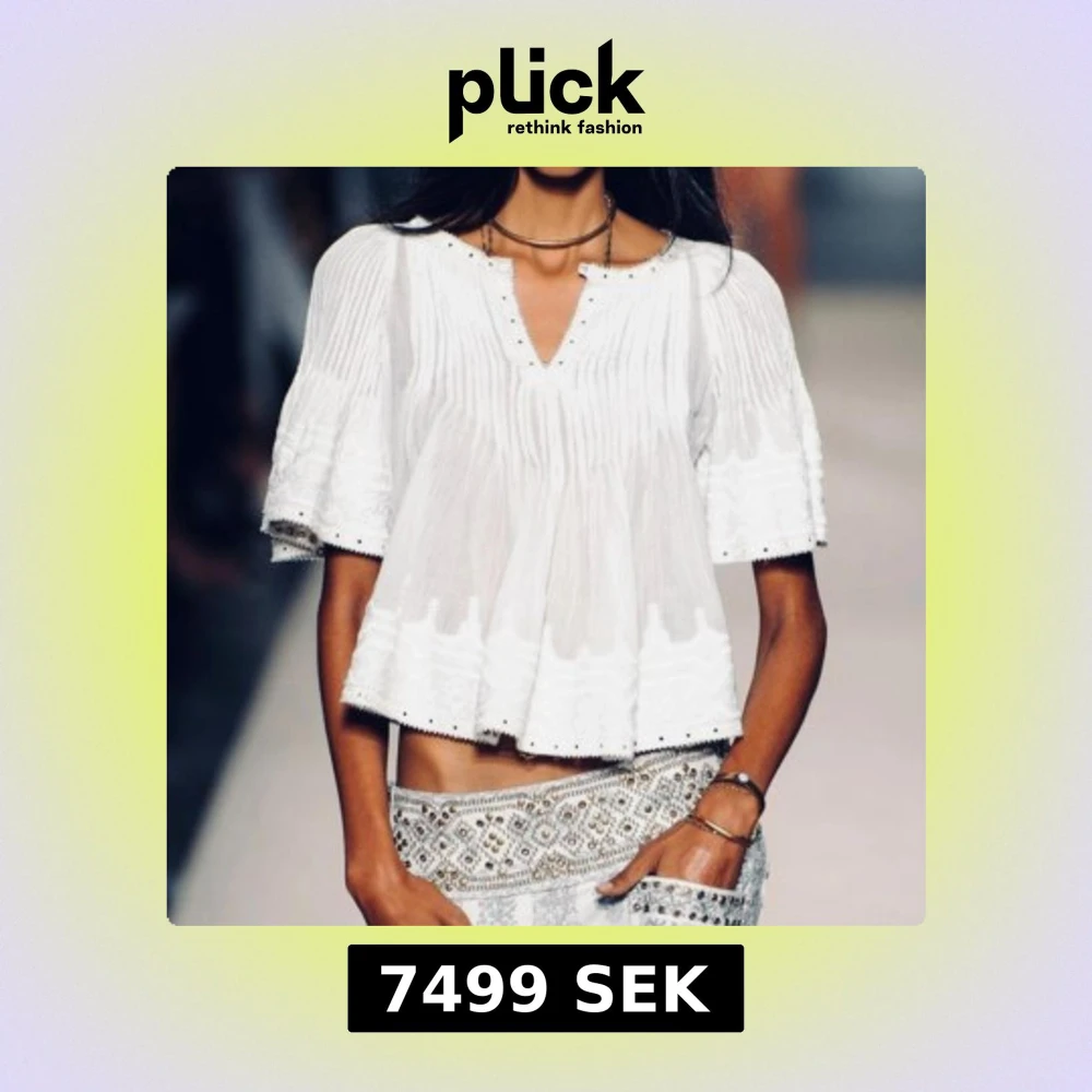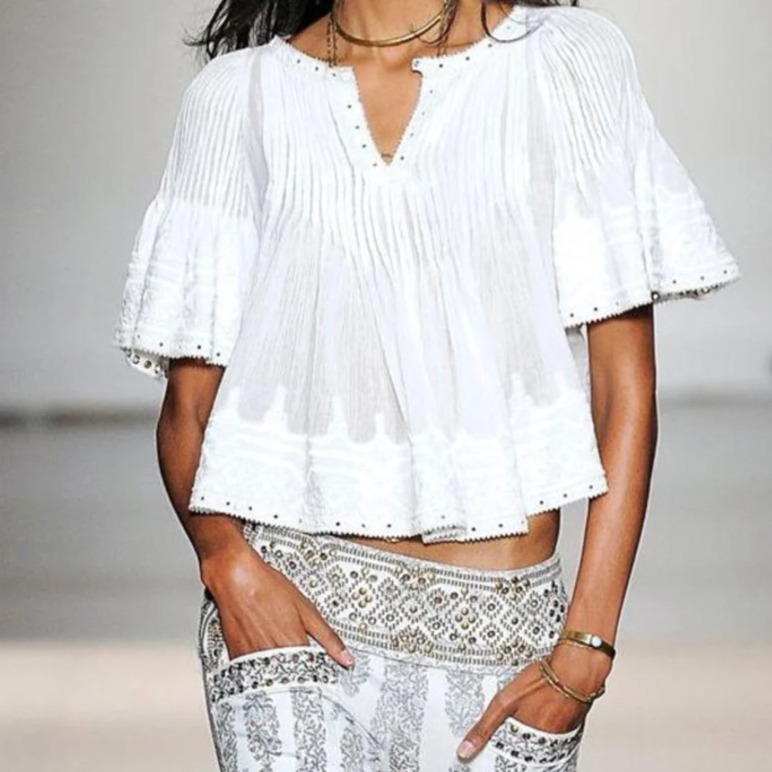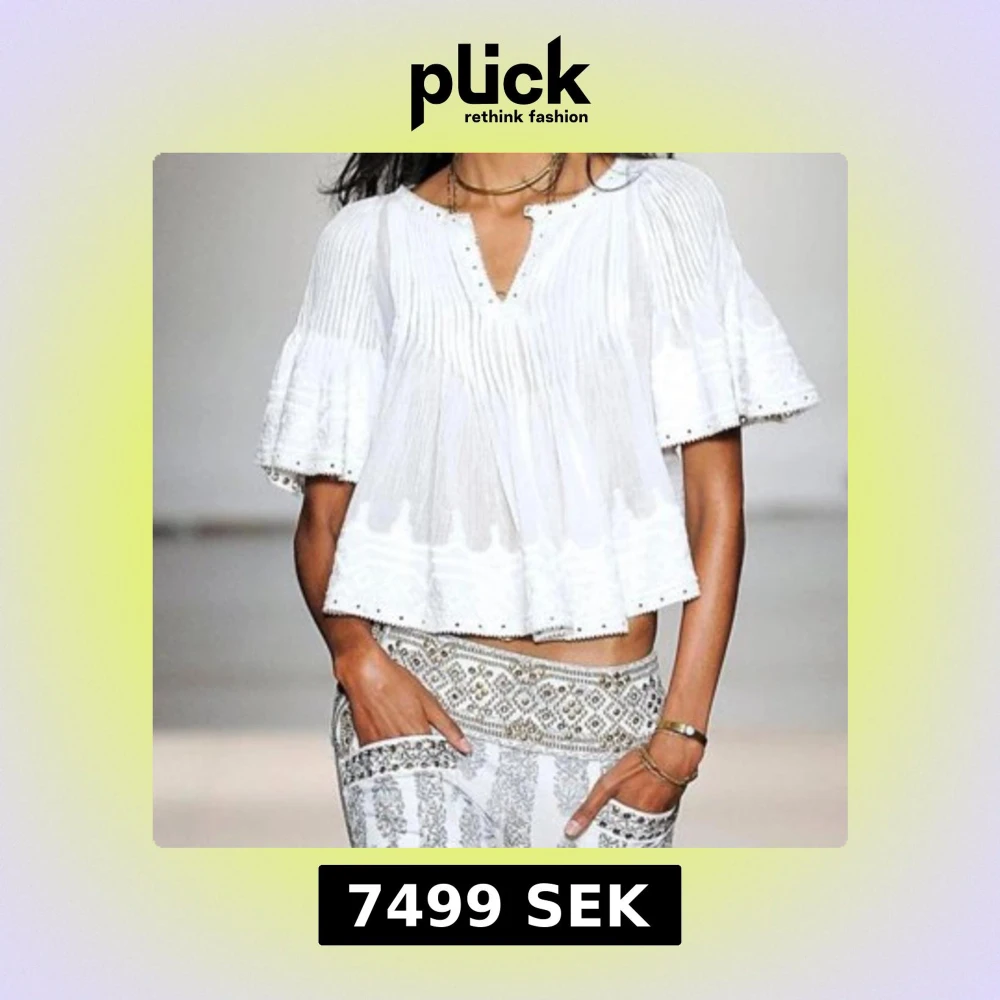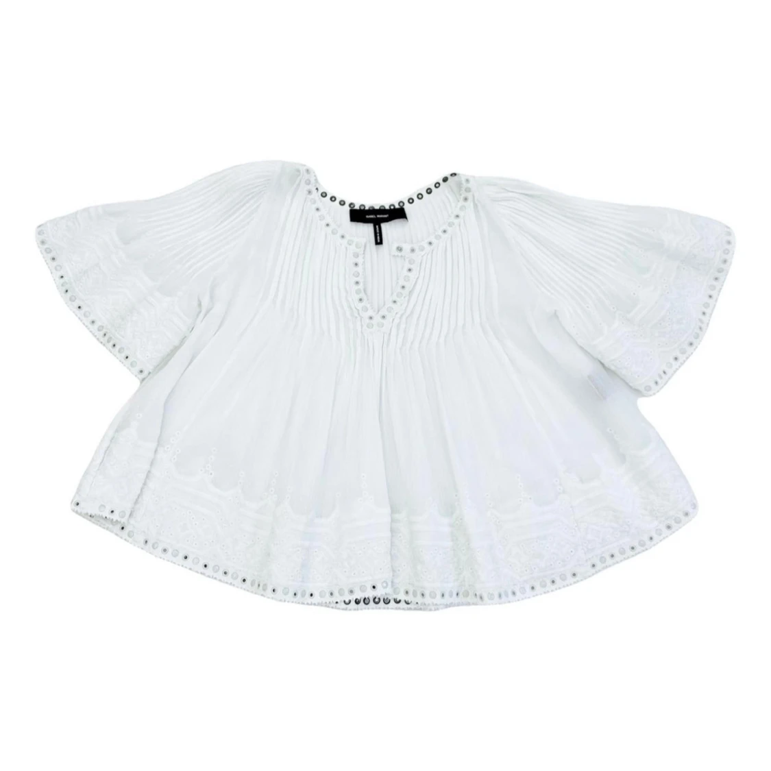 ♡ Stunning rare Alexia blouse by Isabel Marant from the 2013 S/S (Spring/Summer) runway collection. One of her most iconic pieces. ♡ Embroidered eyelet pleated blouse with accented brass stud and grommets around neckline, arm cuffs and hem.♡ Excellent condition. ♡ Size FR38. ♡ 100% cotton, eyelets 100% laiton brass, rivets 100% laiton brass.