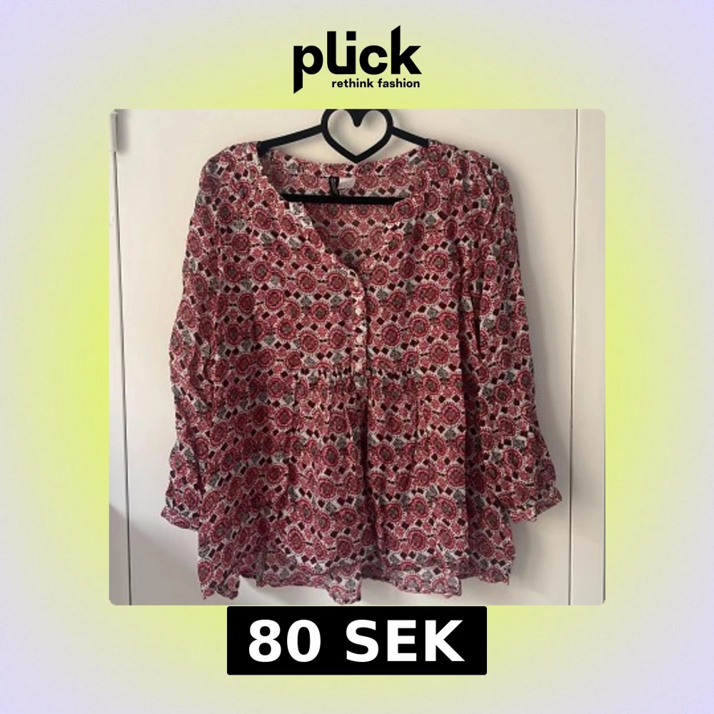 Mörkröd blus med gulligt mönster. Använd endast fåtal gånger och är i jätteskönt material!