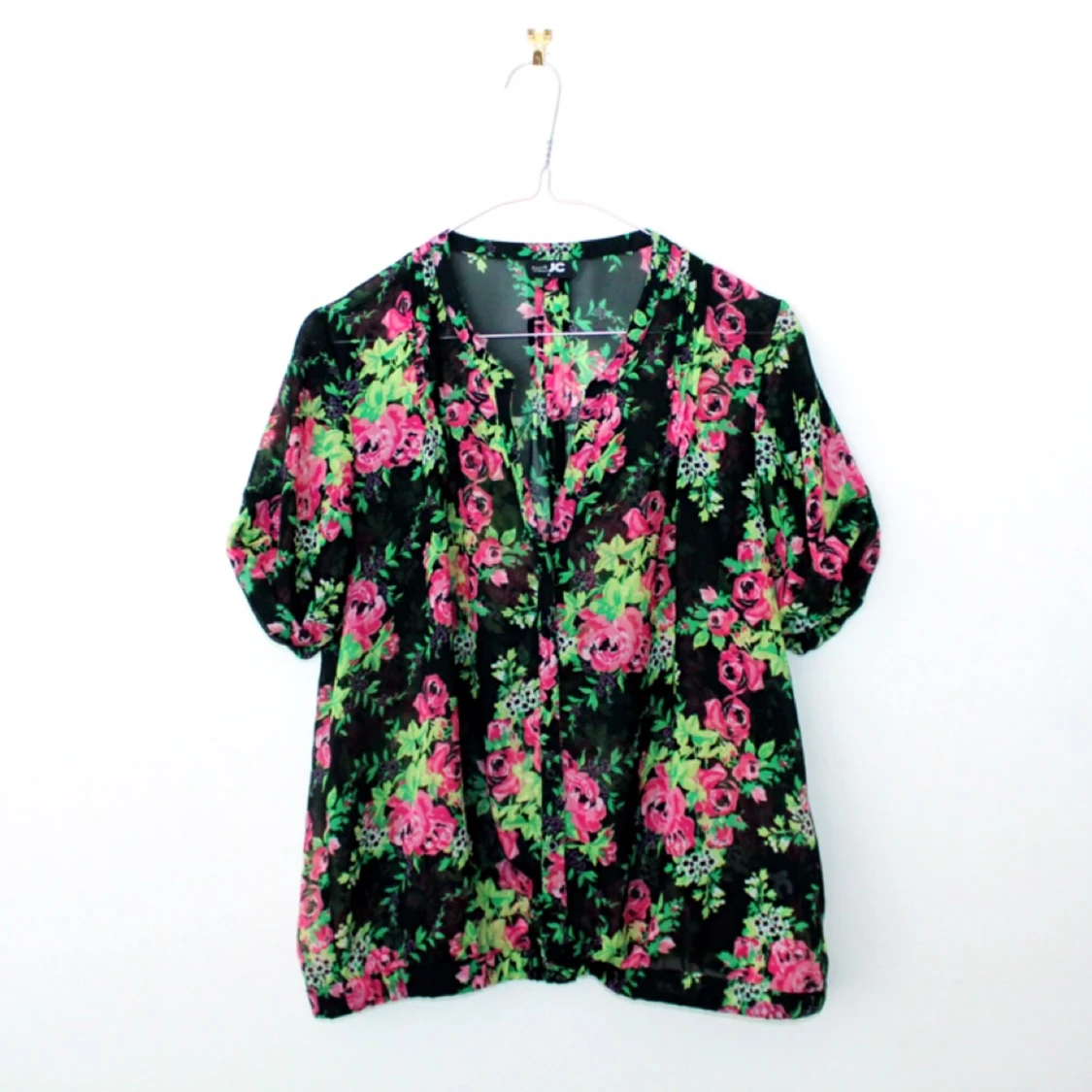 Vacker, blomstrig blus från JC i storlek Medium (passar lika bra för någon som har Small). Knappt använd så den är hel och ren, utan skavanker. 100 % polyester. Jag står för eventuell fraktkostnad.