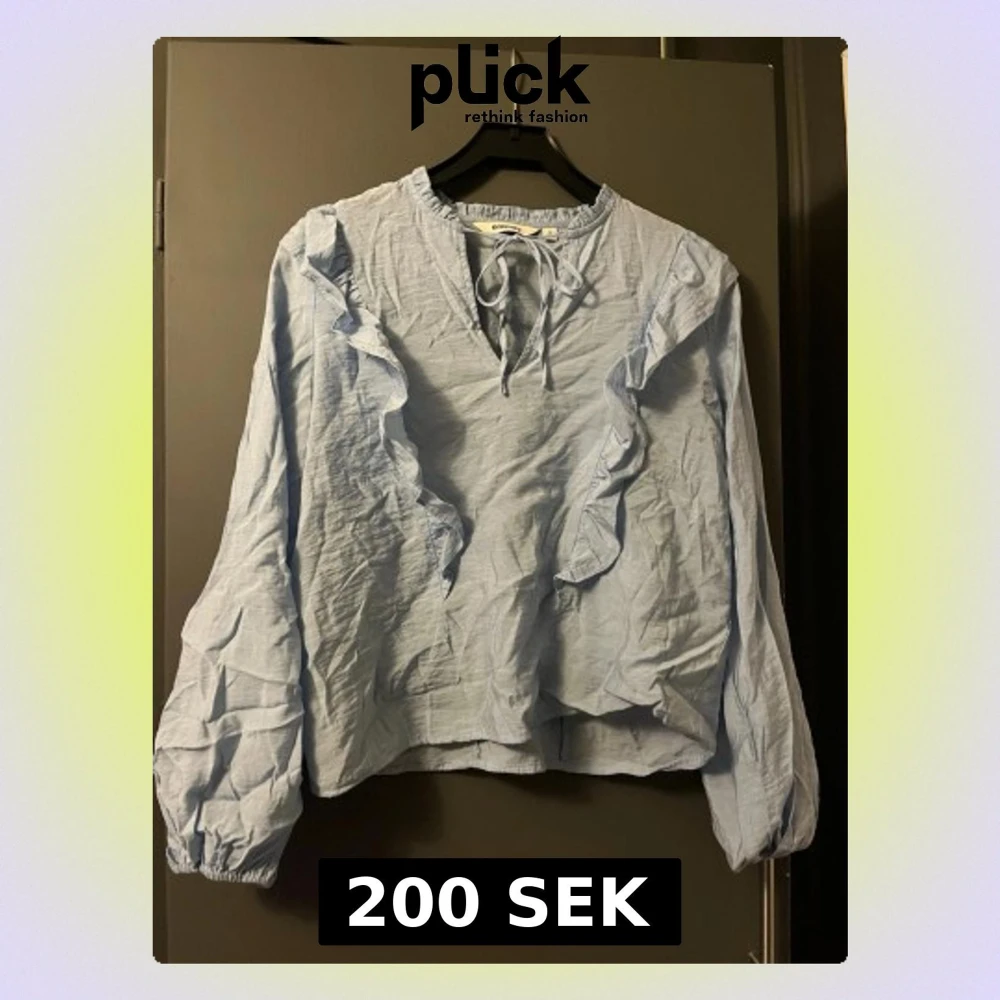 Supersöt ljusblå blus från Kappahl med volangdetaljer framtill och knytning i halsen. (Stryker tröjan innan köp!) Nyskick. Köpt för 400