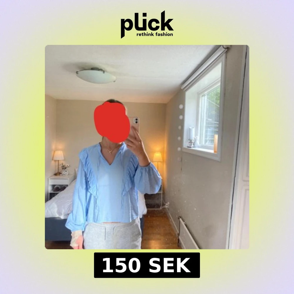 En ljusblå långärmad blus med volanger samt snörning. Inga fläckar eller liknande på den och väldigt bra skick. Storlek S från Kappahl.
