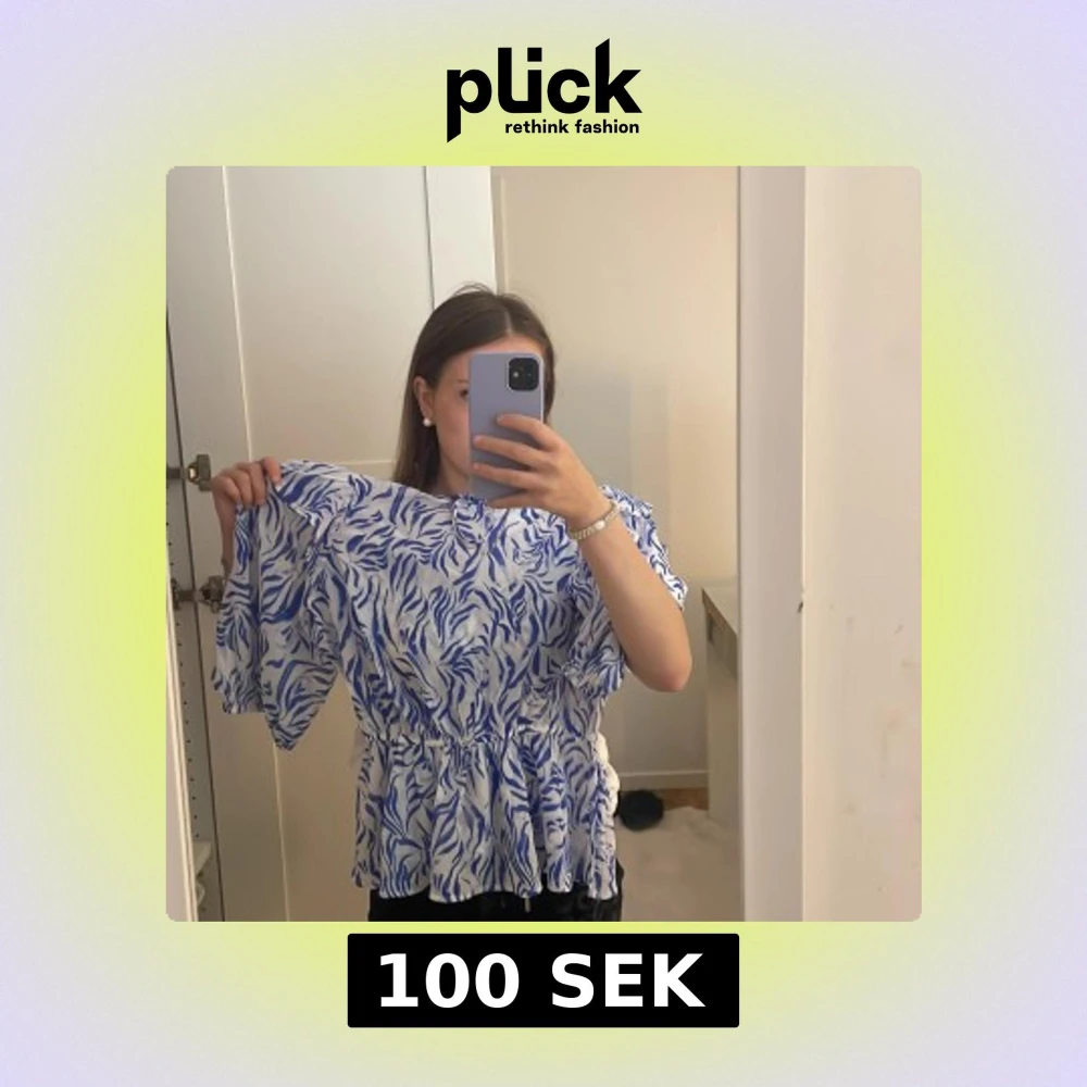 Säljer en blåvit blus med zebramönster från Kappahl. Blusen har volangdetaljer vid axlarna, resår i midjan för snygg passform och korta puffärmar. Materialet är lätt och luftigt, perfekt för varmare dagar. Supersnygg att matcha med jeans eller kjol!