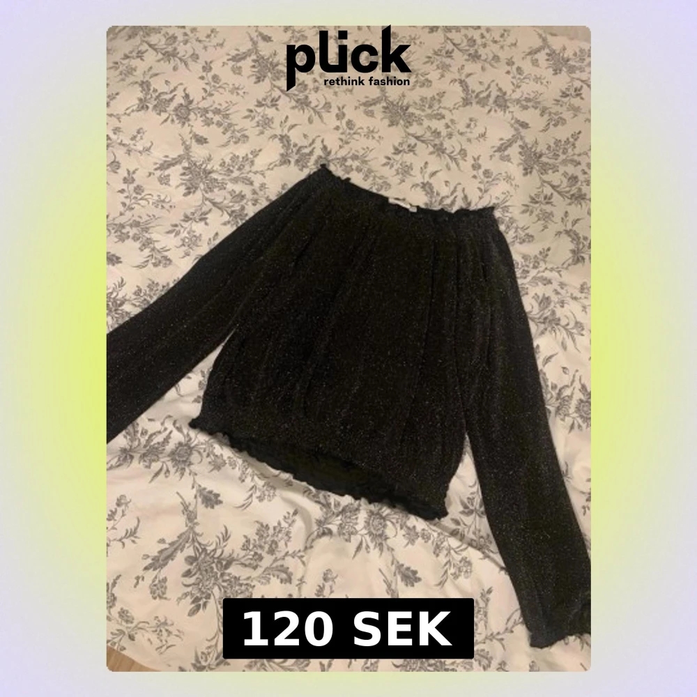 En svart glittrig tröja från Kappahl i storlek 158 men den passar storlek XS-S skulle jag säga för den är väldigt stretchig och lös i passformen. Materialet är jätte skönt och luftigt. En fin blush/tröja som passar bra om man vill klä upp sig!🩷