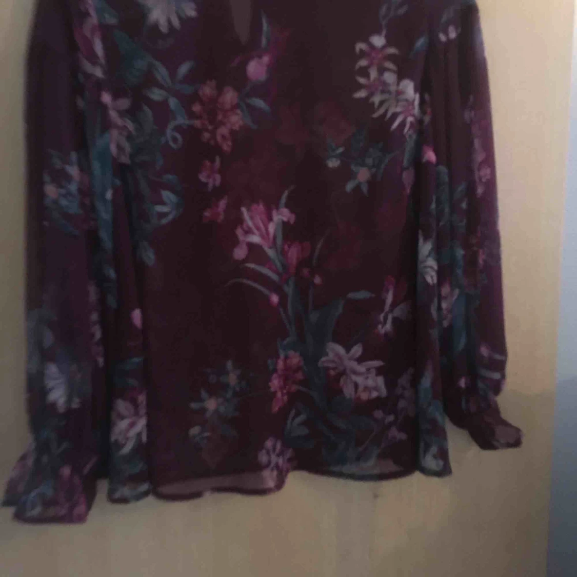 En rödblommig blus med volanger i hals och armar, använd en gång
