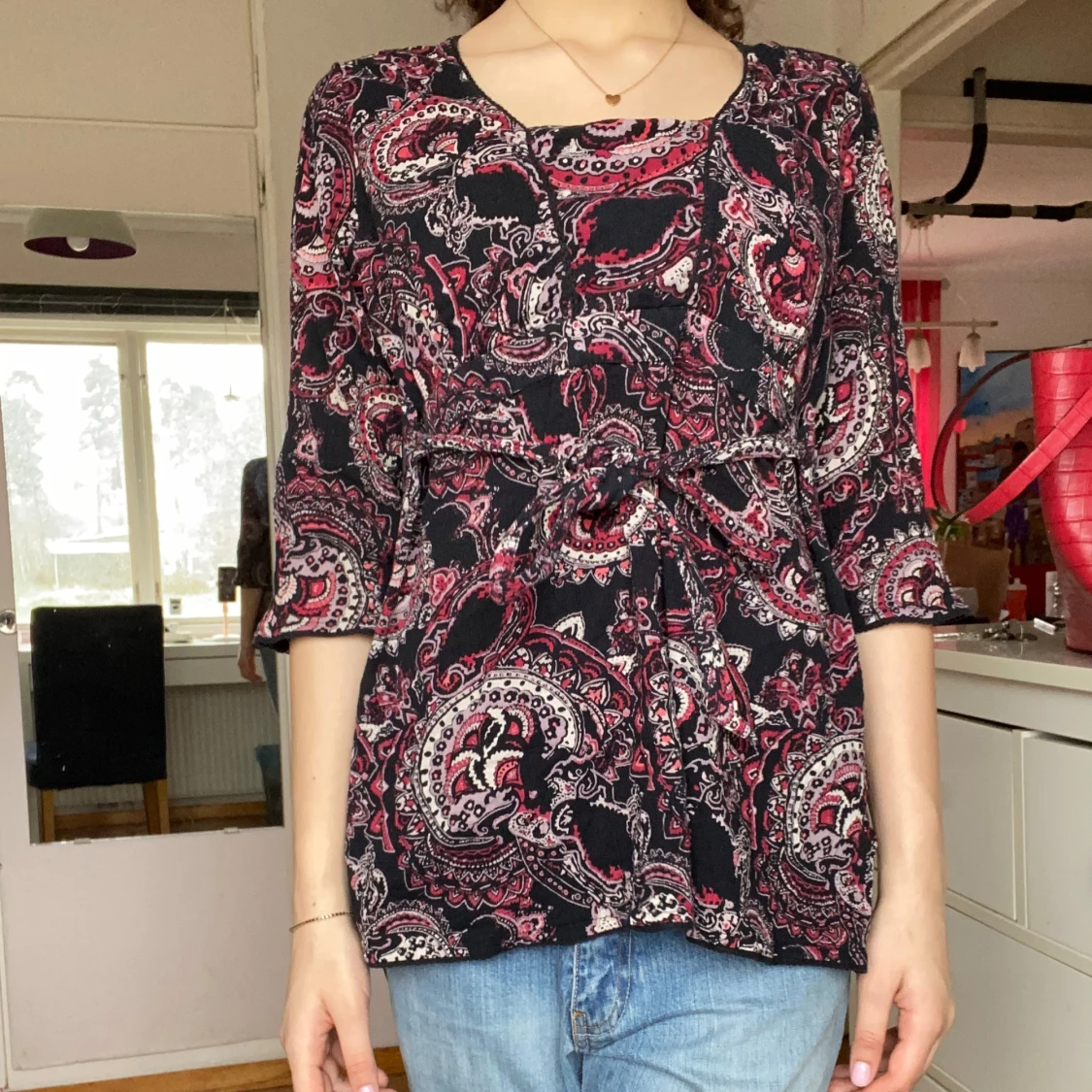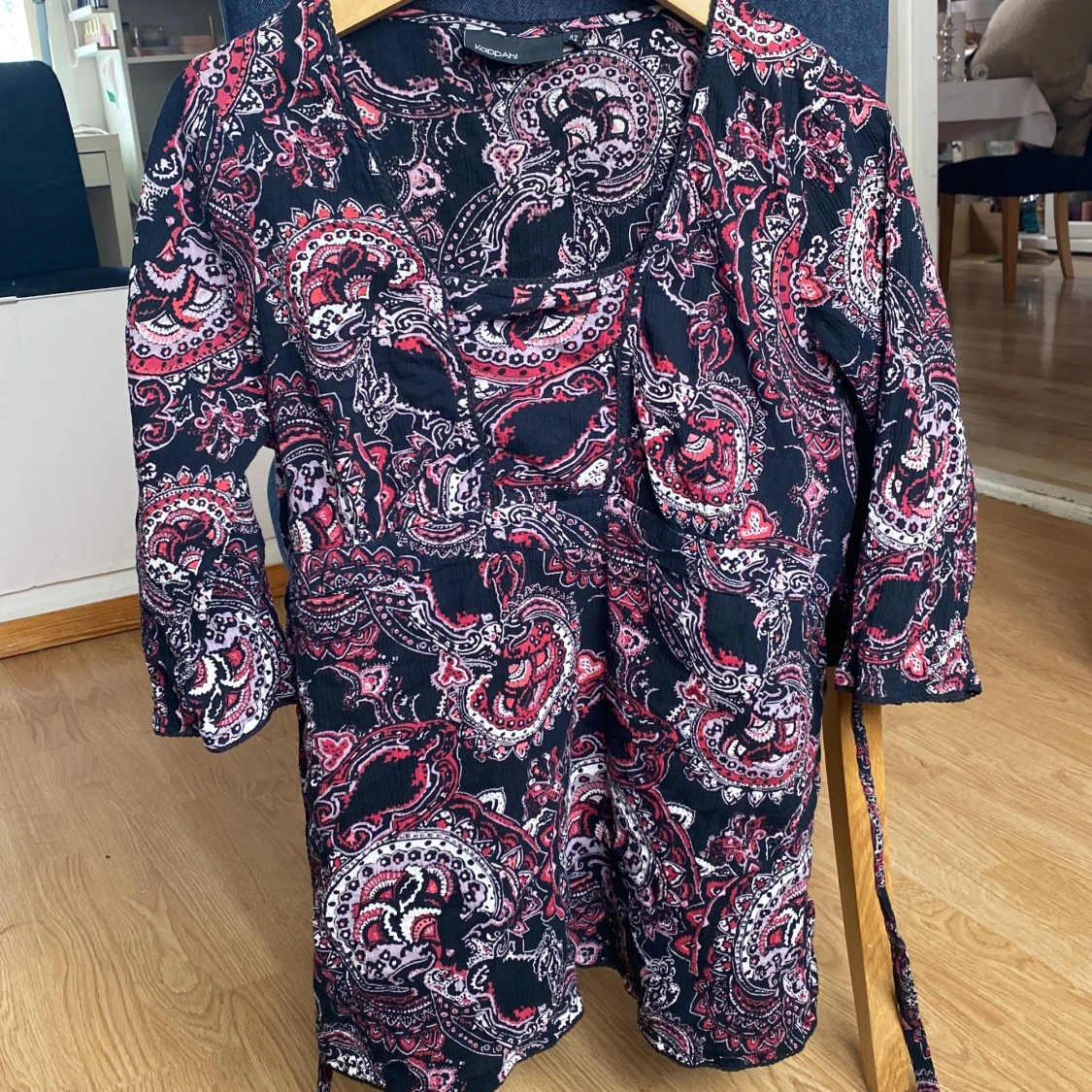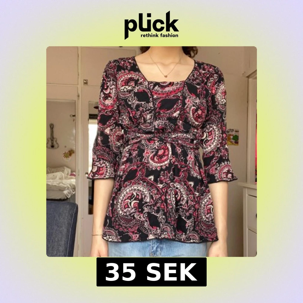 En lång blus med fina mönster på. Storleken är 42 / L men jag tror att man kan köpa den oavsett vilken storlek man har nästan. Man kan ha den som en väldigt kort klänning om man vill det också 🥰 den har två snören på sidan som man kan knyta som man vill 🫶 tryck på köp nu :))