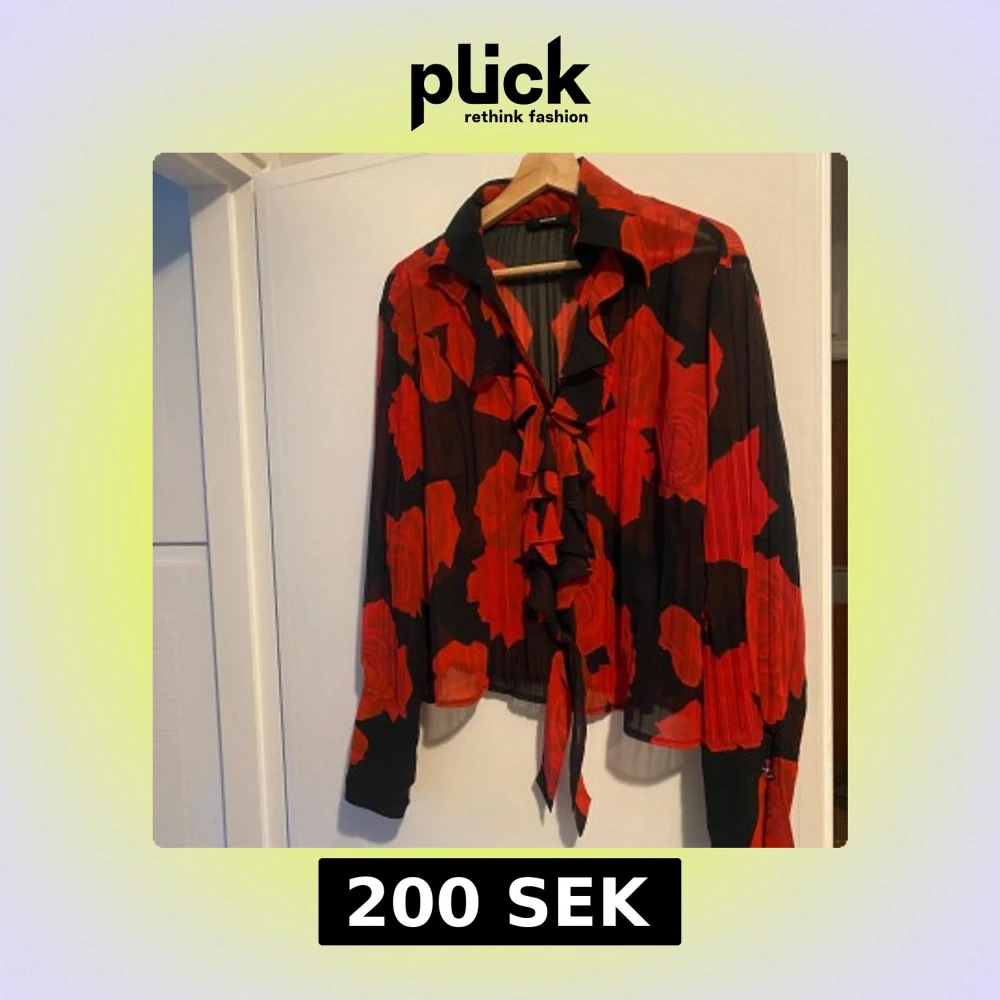 Fin knytblus från Verse, gissar 00-tal, går att ha lös eller knyta i midjan. Vida ärmar och viskos liknade tyg med stort rosmönster🌹