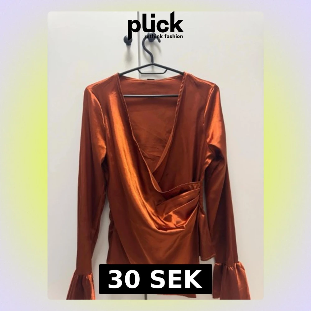 Snygg kopparfärgad omlottblus i glansigt material med djup v-ringning och långa ärmar med volangdetalj vid ärmslutet.