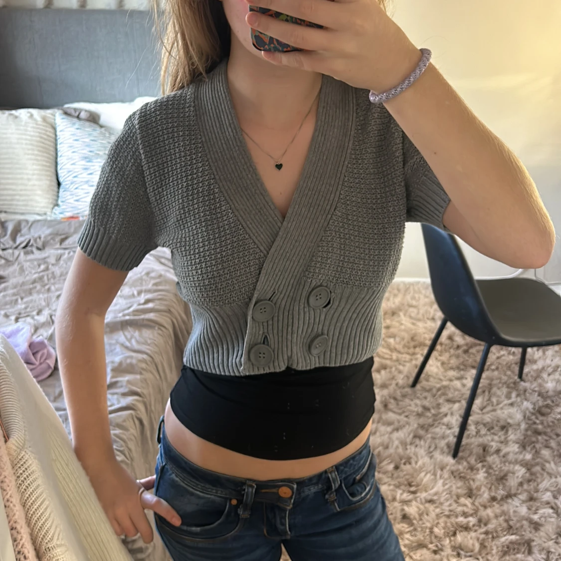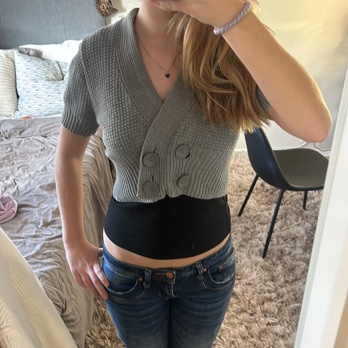 Säljer en kortare kofta i grå💕 Strlk M och sitter bra, har vanligtvis S eller M💞