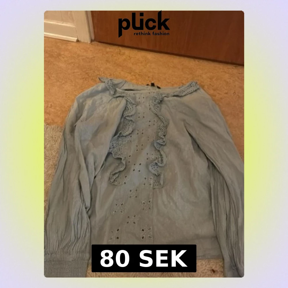 Ljusblå blus med långa ärmar och dekorativa volanger längs framsidan. Blusen har broderade hålmönster och en romantisk känsla. Materialet ser ut att vara lätt och luftigt, perfekt för att skapa en söt och trendig look.