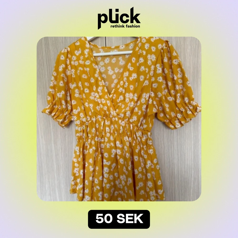 Säljer en superfin gul blus med vita blommor. Den har en v-ringad hals och korta puffärmar med resår. Blusen är i omlottstil och har en elastisk midja som ger en fin passform. Perfekt för sommarens alla fester och tillfällen! 🌼aldrig använd