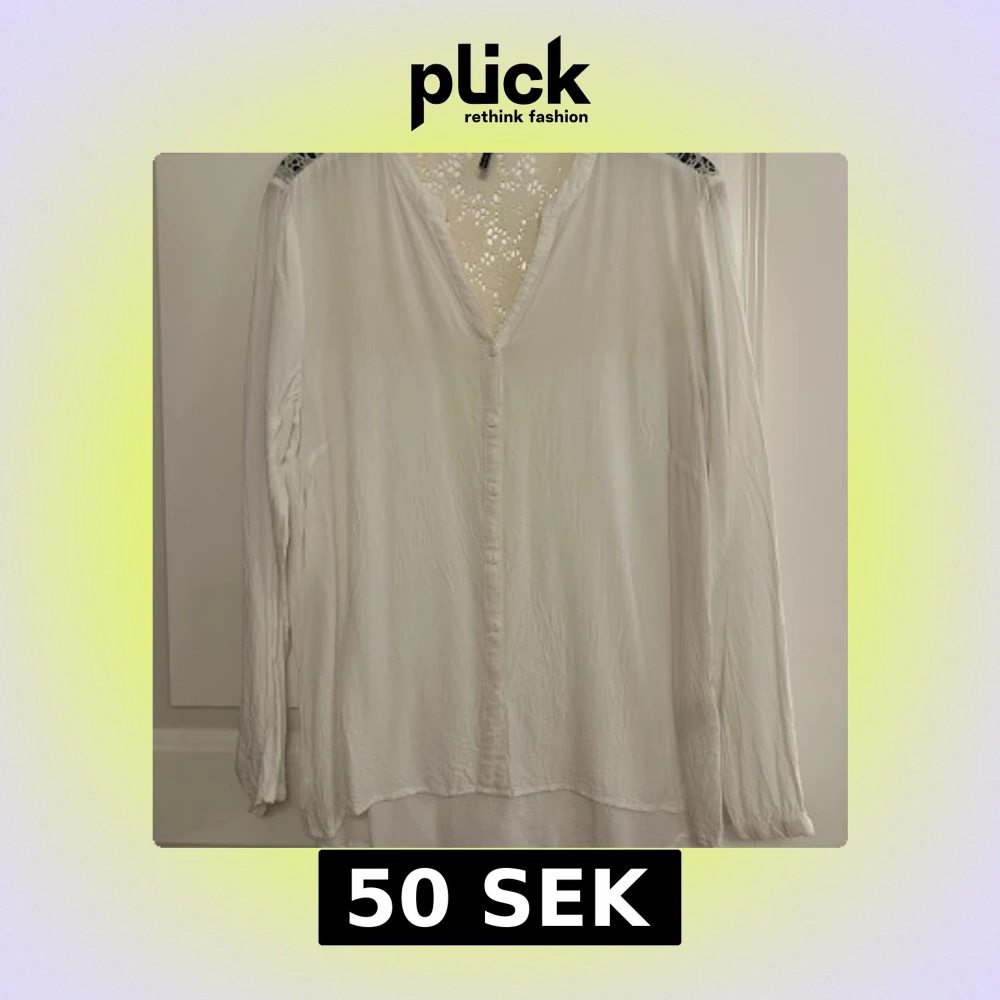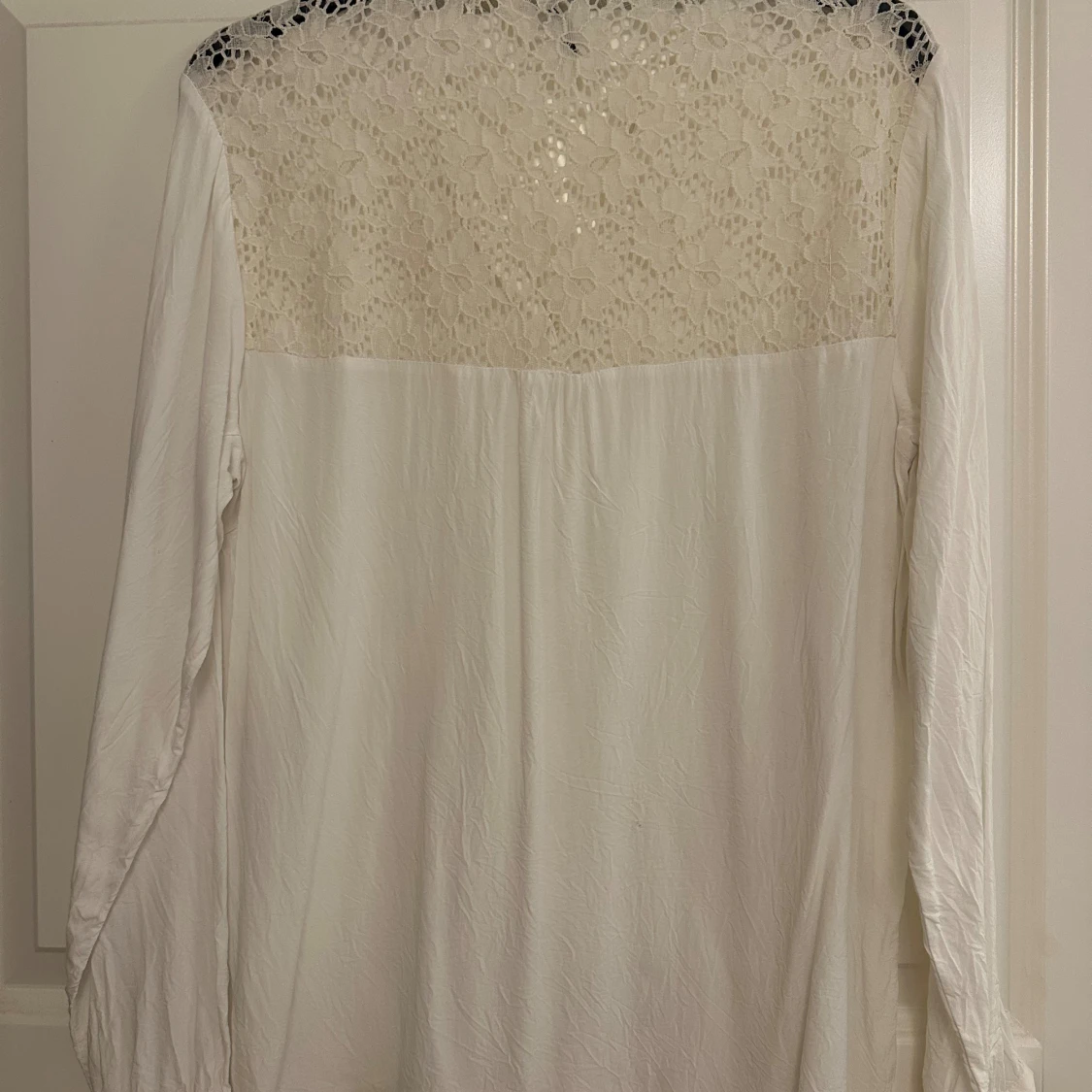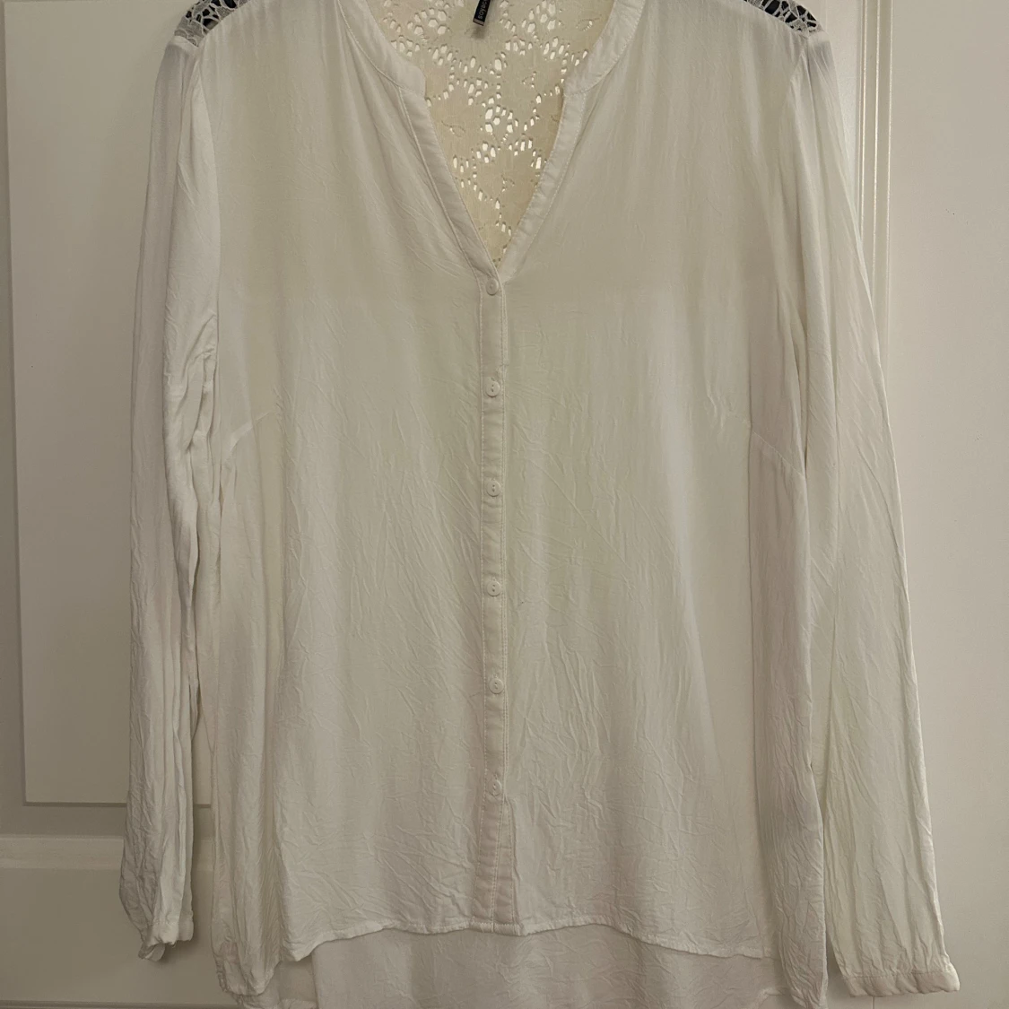 Vit långärmad blus från Soyaconcept med v-ringning och knappar framtill. Blusen har snygga spetsdetaljer upptill på axlar och rygg, vilket ger en romantisk vibe. Lätt och flowy passform, perfekt till jeans eller kjol.