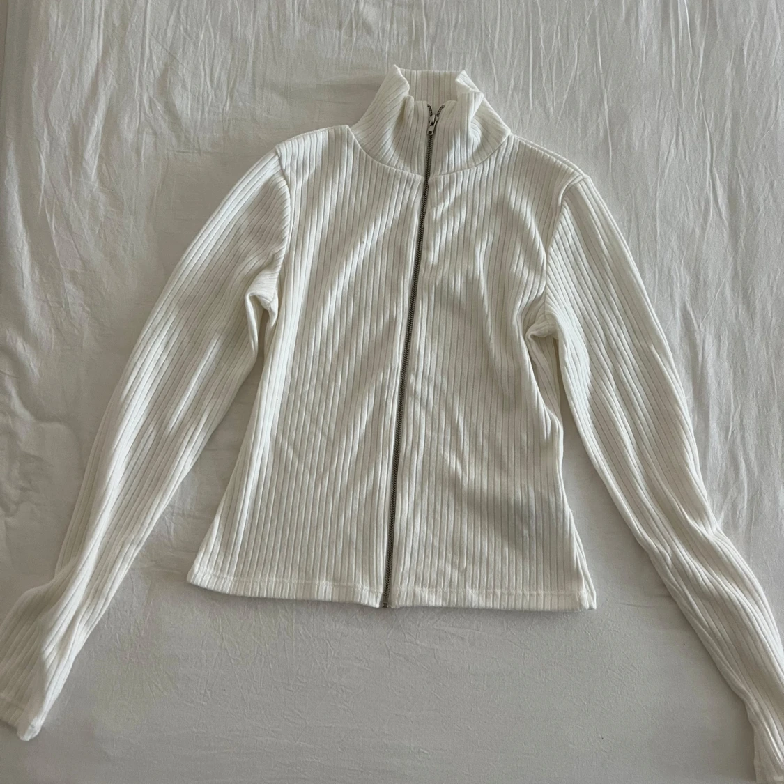 Säljer en stilren vit ribbad kofta med dragkedja. Koftan har en hög krage och långa ärmar, perfekt för en minimalistisk look. Passar bra till både jeans och kjol. Perfekt för vår och höst!
