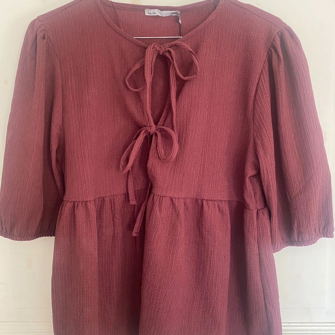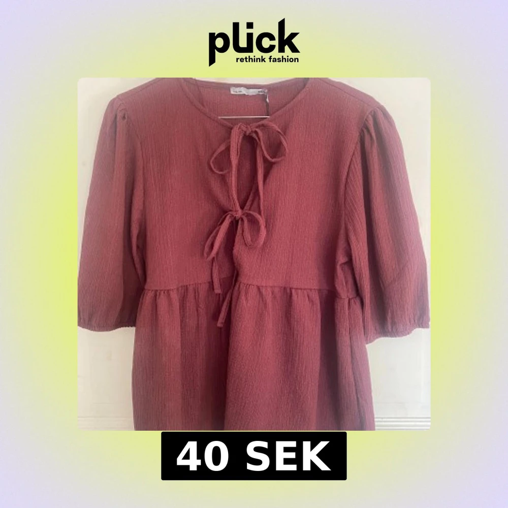 Söt röd blus med knyt framtill och puffiga ärmar. Blusen har en avslappnad passform och är tillverkad i ett strukturerat tyg som ger en mjuk känsla. Perfekt för vår och sommar!