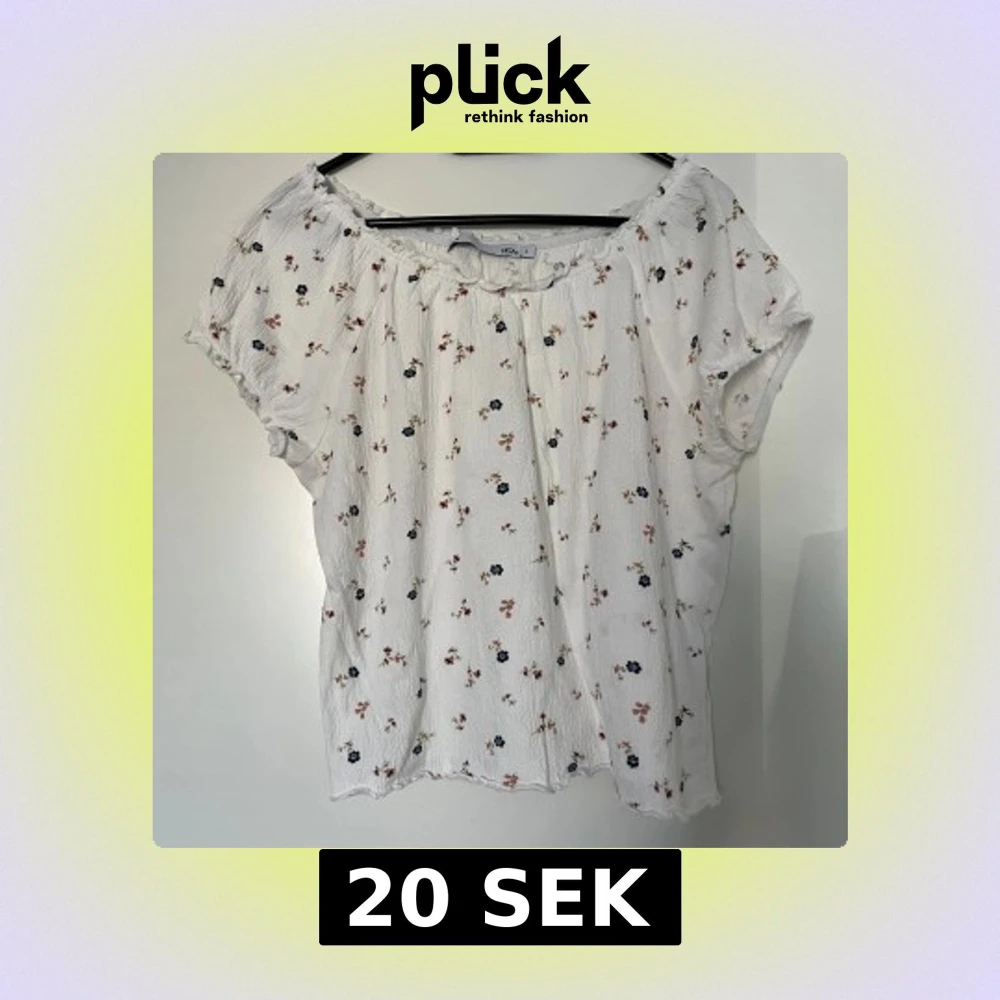 Vit topp med blommigt mönster och korta ärmar från Lager 157. Blusen har en rynkad halsringning och en lätt textur. 100% bomull. Nyskick. Mått: Längd ca 50 cm Byst ca 52 cm Midja ca 48 cm