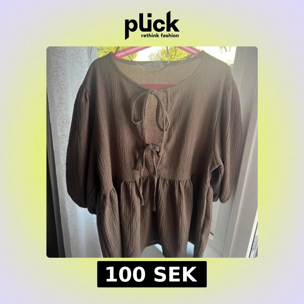 Säljer en brun tröja från 157 i storlek S. Klänningen har ett crinkle-texturerat tyg, långa puffärmar och två snörningar framtill vid halsen. Modellen är loose fit med volangdetaljer vid midjan och är perfekt för dig som gillar avslappnad stil.