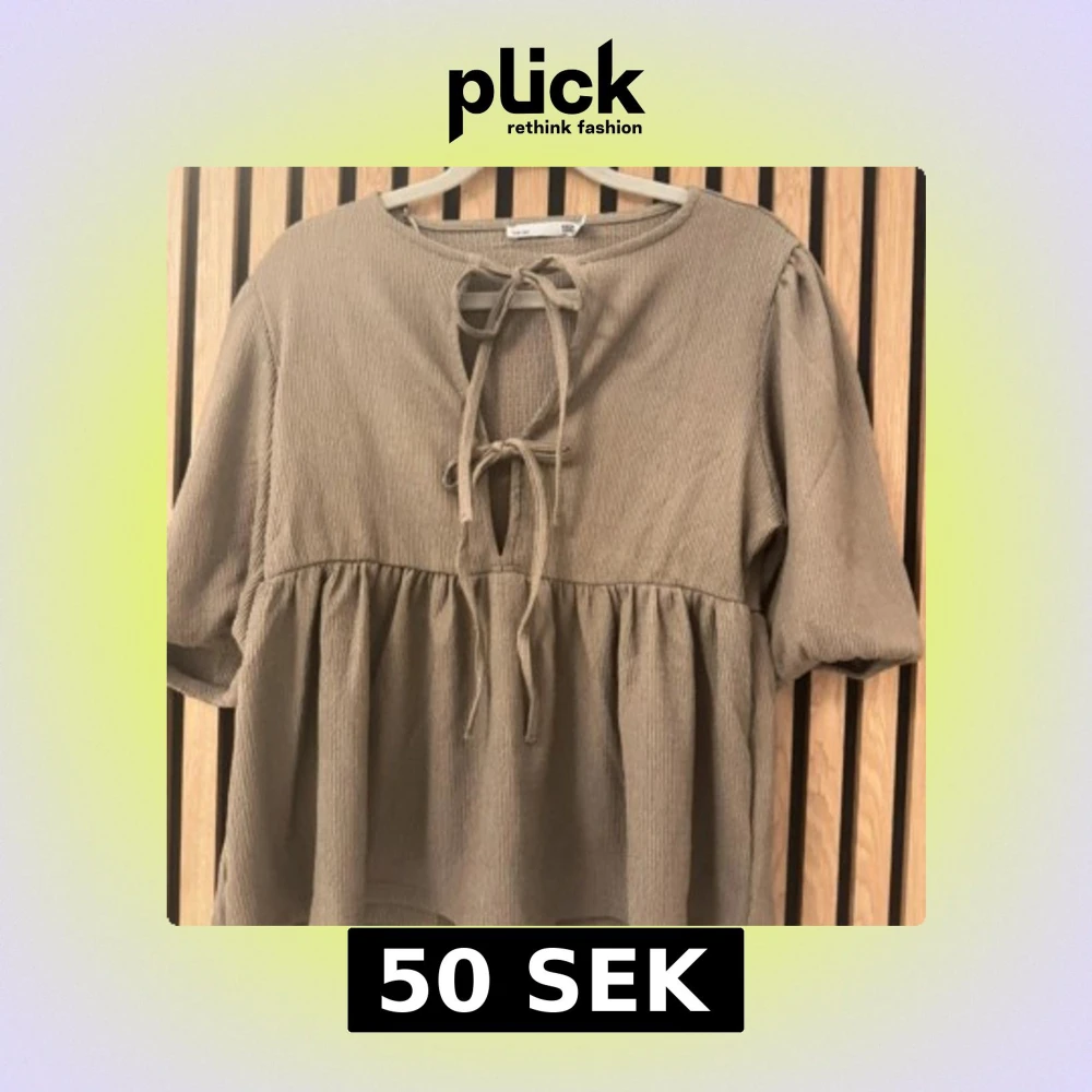 Brun knytblus med korta puffärmar, den har rund halsringning och knytstängning framtill. Tyvärr inte kommit till användning. 🤎