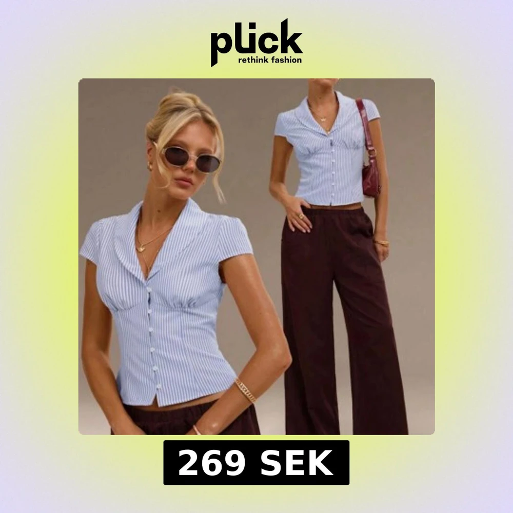 Säljer en kortärmad blus med blå och vita ränder, figurnära passform och snygg krage. Blusen har knappar framtill och lätt markerad midja. Perfekt till vida byxor eller jeans för en trendig look. 🥰