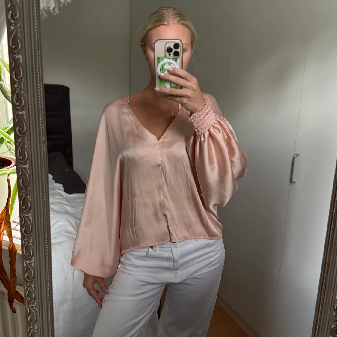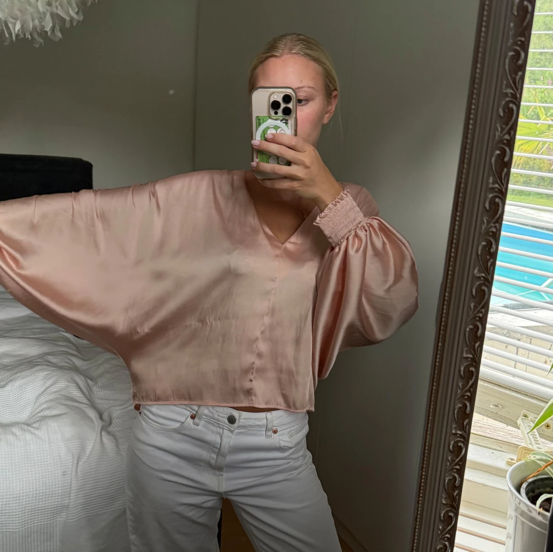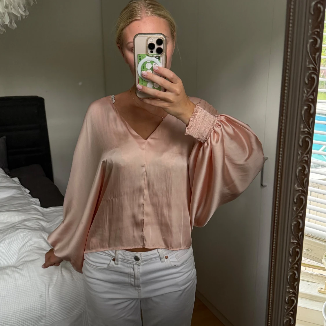 Jättefin och glamorös blus med unika ärmar och ett glansigt material. Den är ifrån Gina Tricot i storlek 36 och passar fint på mig som vanligtvis bär storlek 36. Den passar så bra till fina middagar men även festligheter.