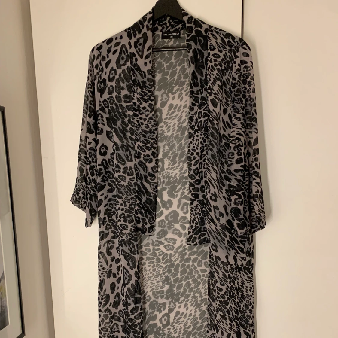 Lång kimono i grått leopardmönster. Gång nedanför knäna. Snygg skärning framtill och i bra kvalite. Använts mycket tidigare men faller inte längre i smaken. I fint skick. Från Sally &circle (Rut & circle) storlek 38 men passar många fler.